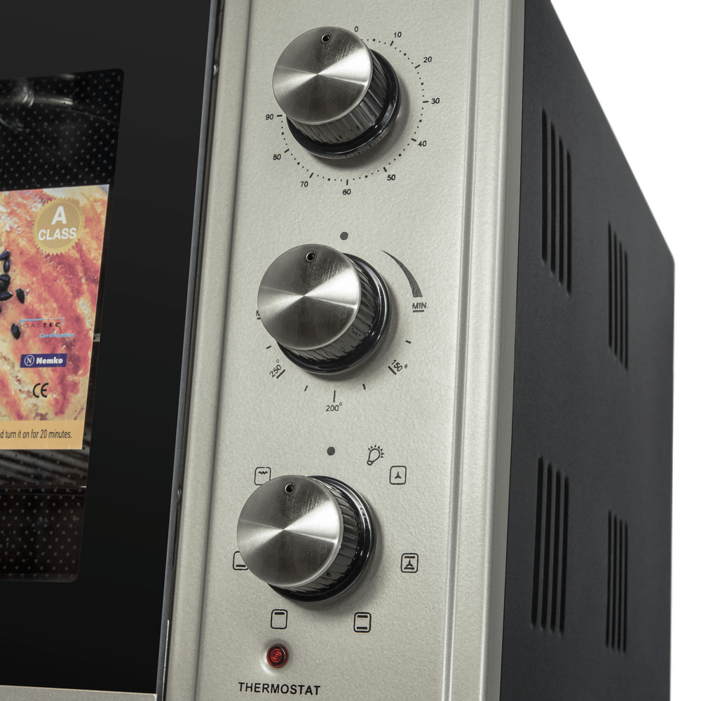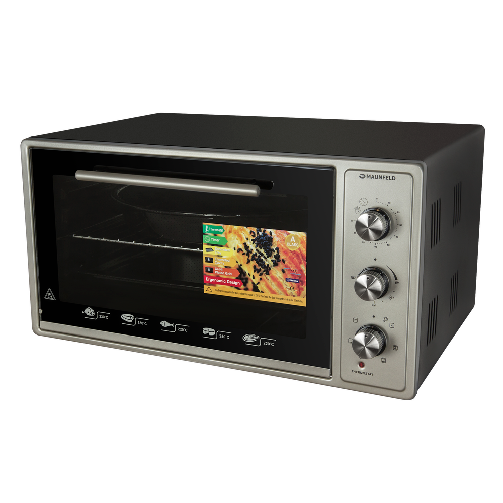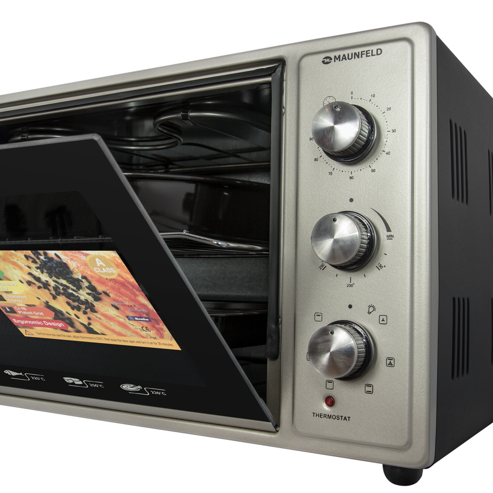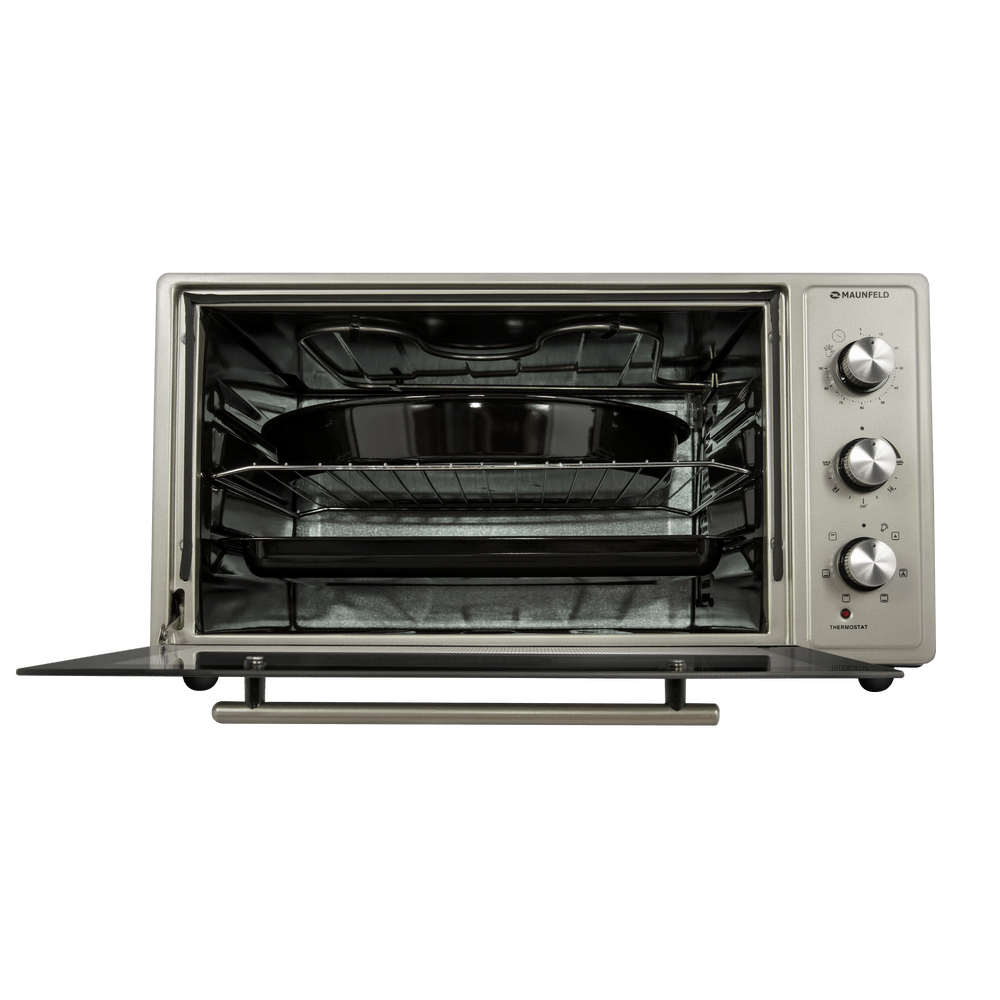 Мини-печь MAUNFELD CEMOA.456.S1 — это отдельностоящий компактный прибор, с помощью которого вы сможете готовить разнообразные блюда даже ресторанного уровня. Устройство выполнено в стиле модерн, лаконичный дизайн позволит вписать прибор в любой интерьер. Дизайнеры использовали универсальные цвета — серебристый и черный. Такое устройство будет красиво смотреться на кухне с любым интерьером, будет не только радовать своим большим функционалом, но и приятно удивлять эстетичностью. Механическая панель управления удобна в эксплуатации, нужно просто повернуть поворотный переключатель, который вращается плавно, до необходимого значка рядом. Комплектация предусматривает наличие решетки для гриля, прямоугольного противня, круглого противня. С помощью таких приспособлений вы сможете готовить блюда из мяса, птицы, рыбы и овощей. В печах Маунфилд выпечка получается хрустящей снаружи и мягкой внутри. Для работы имеется семь функций. Среди них гриль и конвекция, комбинируя их вместе можно получить сочное з