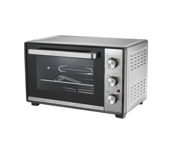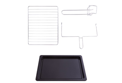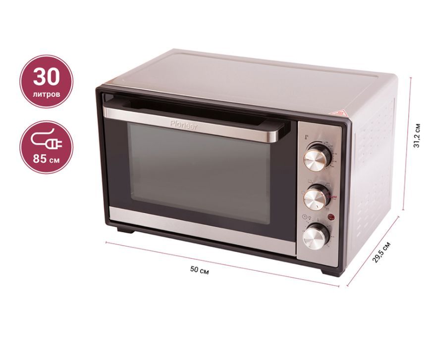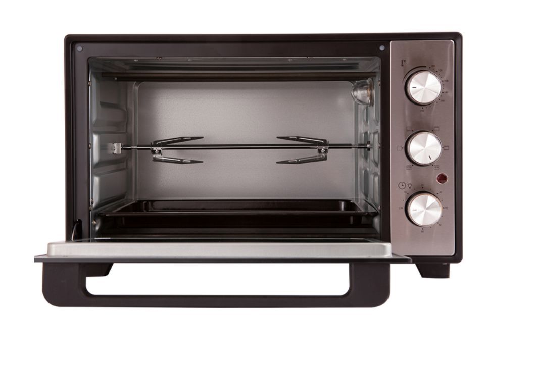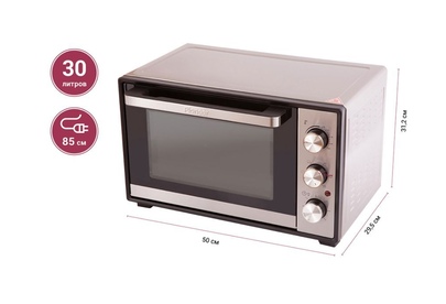 Печь электрическая, объем камеры печи 30 литро, механическое управление, двойное жаропрочное стекло, потребляемая мощность 1600 Вт, температура нагрева печи: 100-250°С, функция электрического гриля, электромеханический вертел, 6 режимов нагрева, таймер до 60 минут, индикация включения, сигнал окончания приготовления, внутренняя подсветка, металлическая решетка, плоский противень, вертел, держатель для вертела, ухват