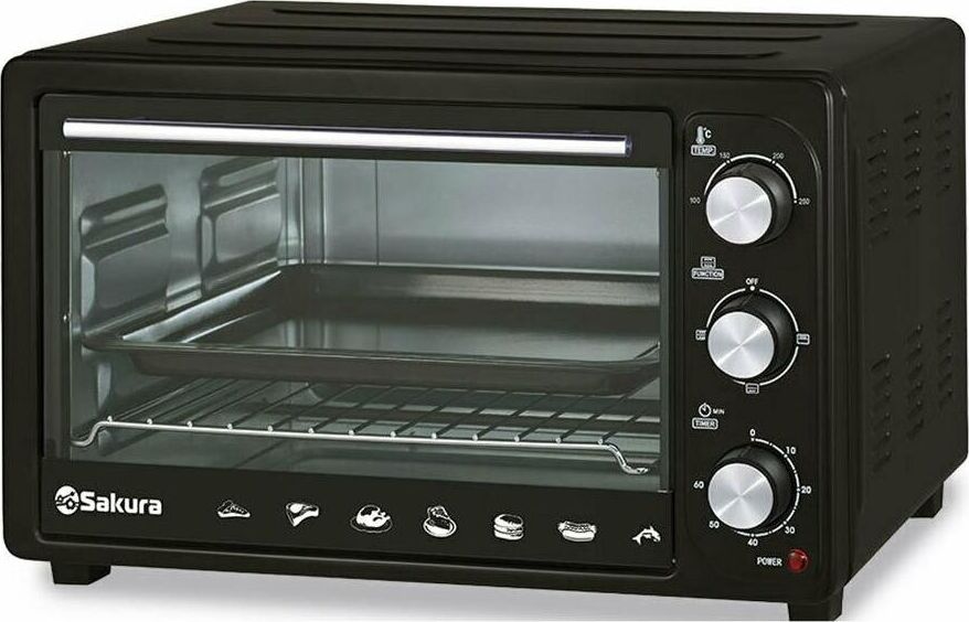 Объем 30л, мощность духовки 1500Вт, механическое управление, 3 режима работы духовки (верх, низ, верх+низ), таймер на 60 минут со звонком, регулировка температуры духовки, комплектация - металлическая решетка, противень и ухват.