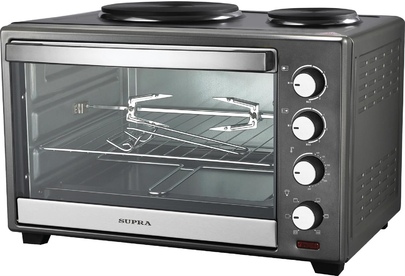Электрическая печь с грилем и конфорками, объем: 35 л, потребляемая мощность: 1850 Вт, механическое управление, гриль, электрический гриль, температура: 100-250°С, внутренняя подсветка, 6 режимов нагрева, индикация включения, комплектация: металлическая решетка, плоский противень, насадка для шашлыка/кебаба, ухват для противня, вертел, ухват для вертела