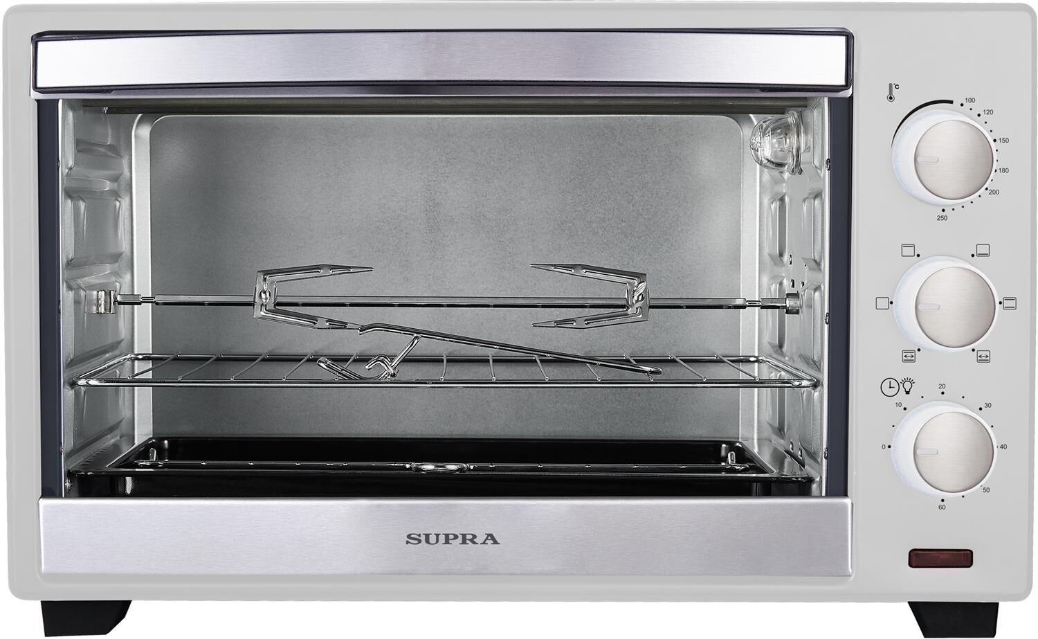 Электрическая печь с грилем, объем: 45 л, потребляемая мощность: 2000 Вт, механическое управление, гриль, электрический гриль, температура: 100-250°С, таймер отключения: до 60 минут, сигнал окончания приготовления, внутренняя подсветка, 6 режимов нагрева, индикация включения, комплектация: металлическая решетка, плоский противень, круглая форма для пиццы, ухват для противня, вертел, ухват для вертела