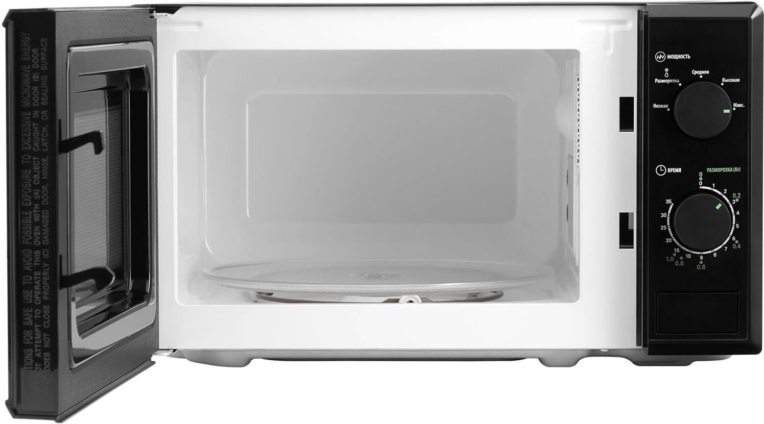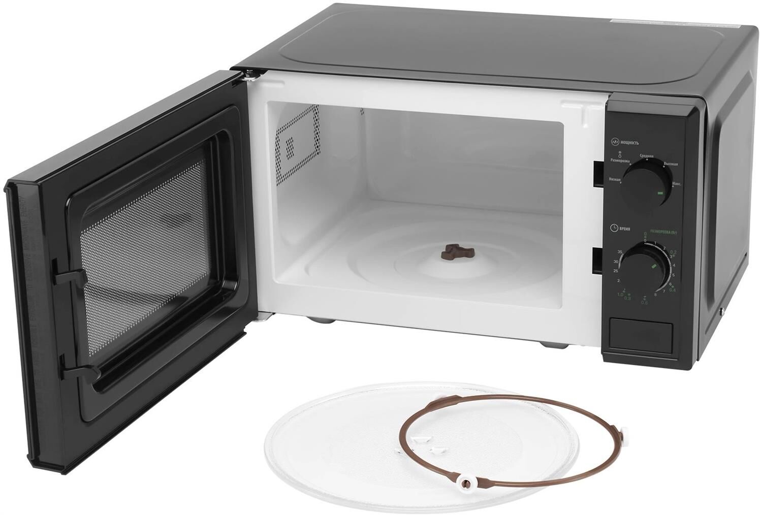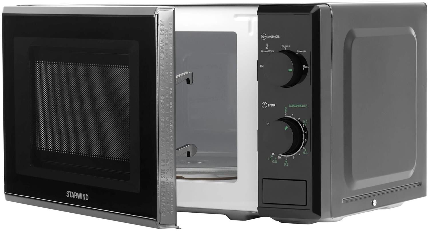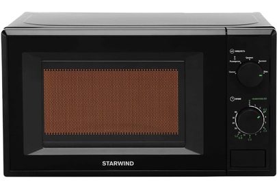 Микроволновая печь Starwind SWM5820 привлекает к себе внимание современным дизайном, корпус черного цвета подойдет для любого стиля интерьера. Оборудование имеет довольно простую конструкцию и компактные размеры. Использовать его можно как дома, так и в офисе. Бытовая техника поможет во время обеденного перерыва быстро подогреть еду. В домашних условиях микроволновую печь удобно использовать для размораживания продуктов, полноценного приготовления различных блюд. Мощность устройства составляет 700 Ватт. Внутренняя часть имеет объем в 20 литров, покрытие у нее из эмали, которая легко и быстро чистится. Управлять бытовым прибором необходимо с помощью поворотных рукояток, позволяющих установить нужно время нагрева и температуру.