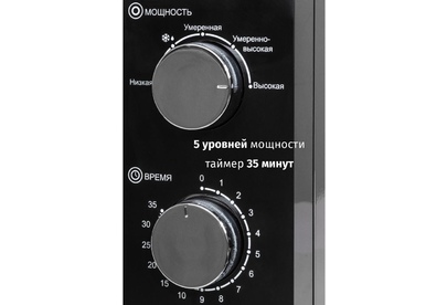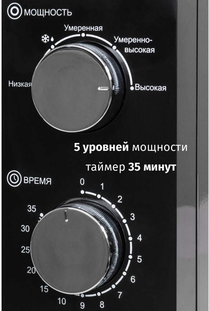 Печь микроволновая, объем 20л, выходная мощность 700 Вт, тип управления: механический, диаметр поворотного стола: 255 мм, количество уровней мощности: 5, автоматическое размораживание, таймер: 35 минут, тип открывания дверцы: ручка, сигнал окончания приготовления, цвет: черный