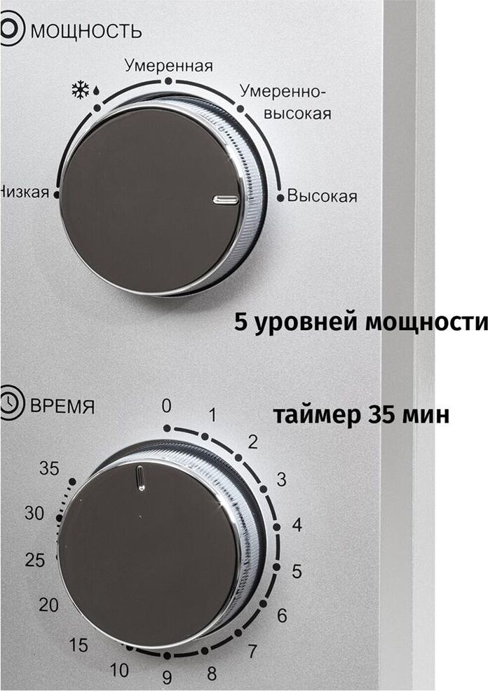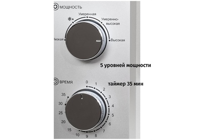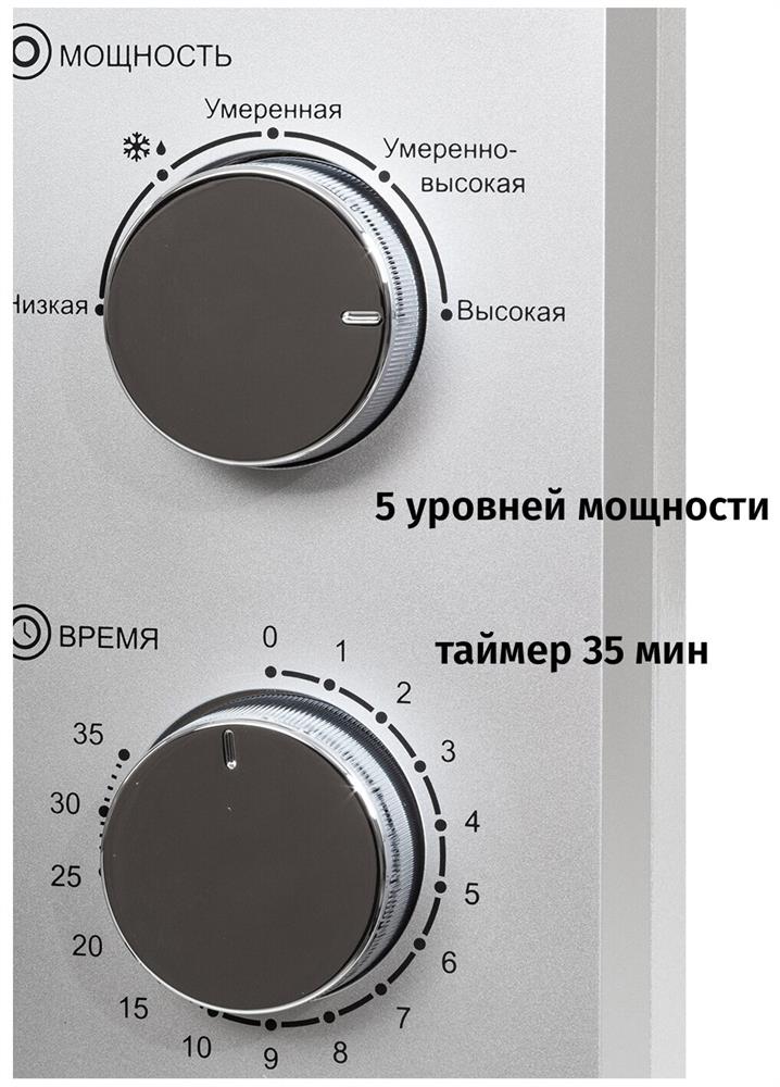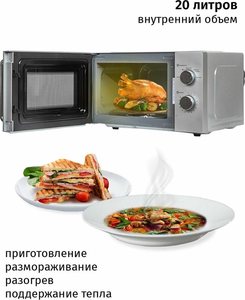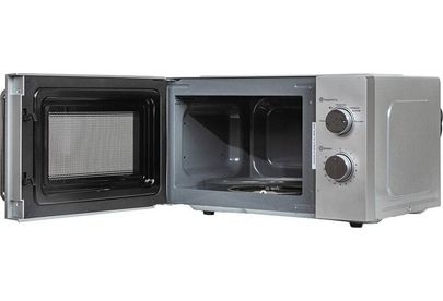 Печь микроволновая, объем 20л, выходная мощность 700 Вт, тип управления: механический, диаметр поворотного стола: 255 мм, количество уровней мощности: 5, автоматическое размораживание, таймер: 35 минут, тип открывания дверцы: ручка, сигнал окончания приготовления, цвет: серебро