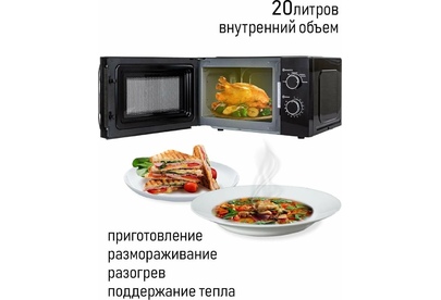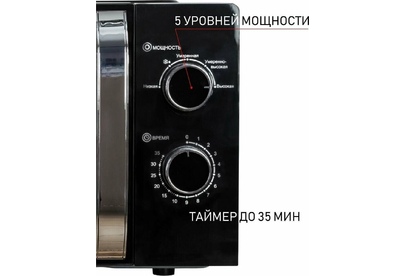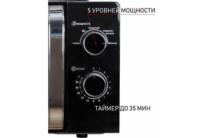Печь микроволновая, объем 20л, выходная мощность 700 Вт, тип управления: механический, диаметр поворотного стола: 255 мм, количество уровней мощности: 5, автоматическое размораживание, таймер: 35 минут, тип открывания дверцы: ручка, сигнал окончания приготовления, цвет: черный