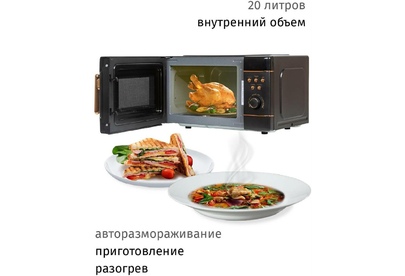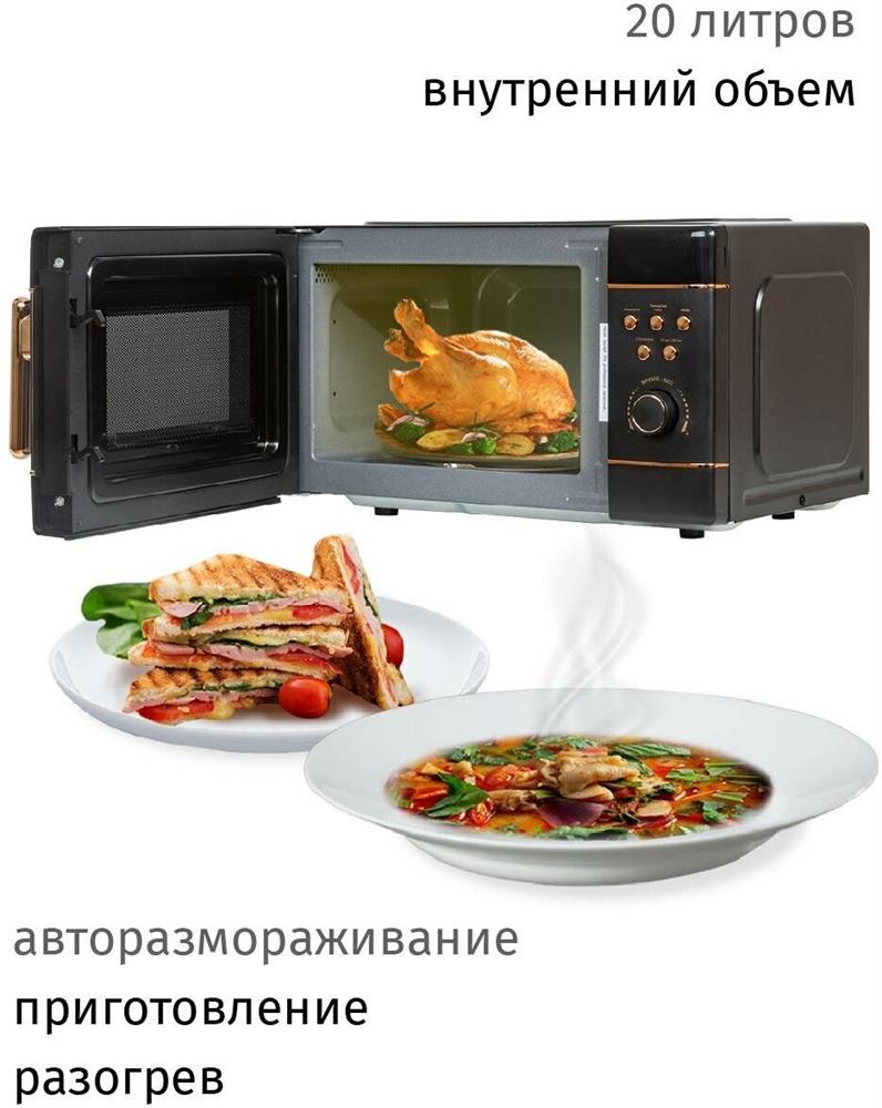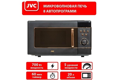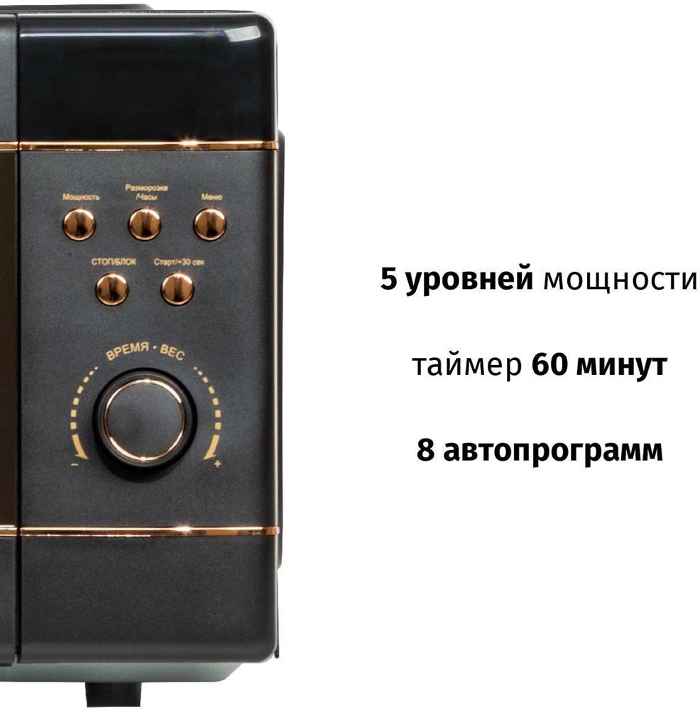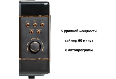 Печь микроволновая, объем 20л, выходная мощность 700 Вт, тип управления: цифровой, диаметр поворотного стола: 255 мм, количество уровней мощности: 5, количество программ автоматического приготовления: 8, автоматическое размораживание, таймер: 60 минут, блокировка от детей, тип открывания дверцы: ручка, сигнал окончания приготовления, цвет: черный