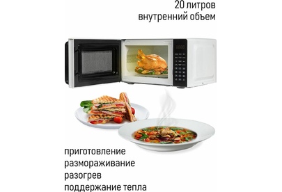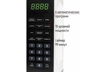 Печь микроволновая, объем 20л, выходная мощность 700 Вт, тип управления: сенсорная, 10 уровней мощности, 6 программ автоприготовления, разморозка по весу и времени, таймер на 99 минут, блокировка от детей, диаметр поворотного стола 245 мм, сигнал окончания приготовления.