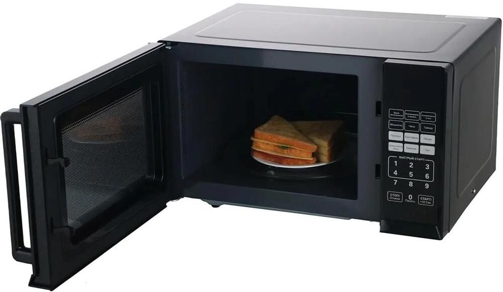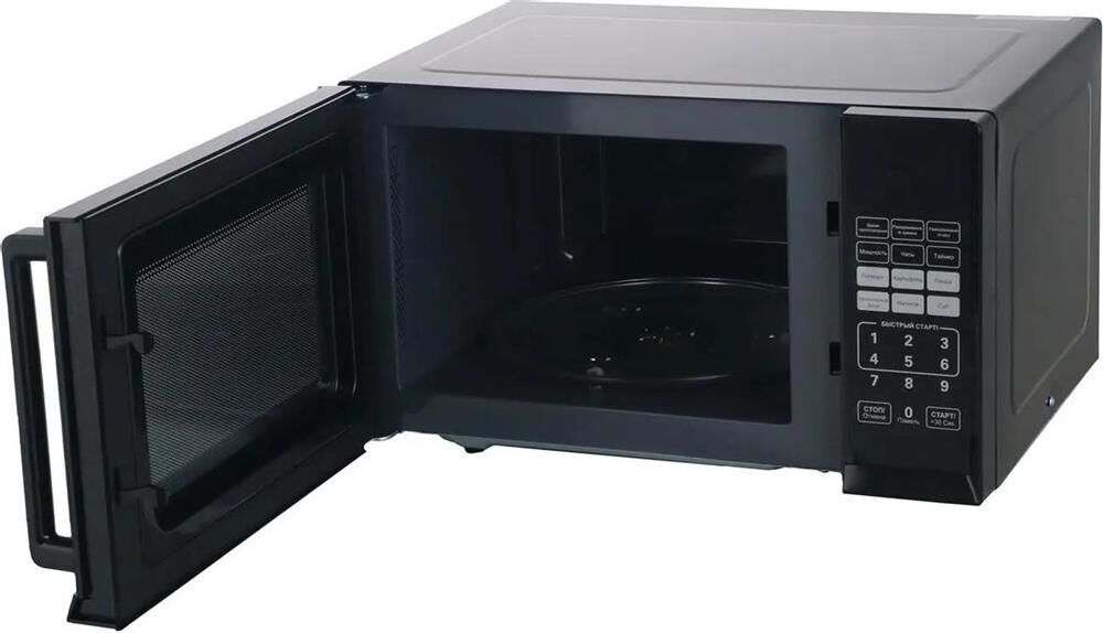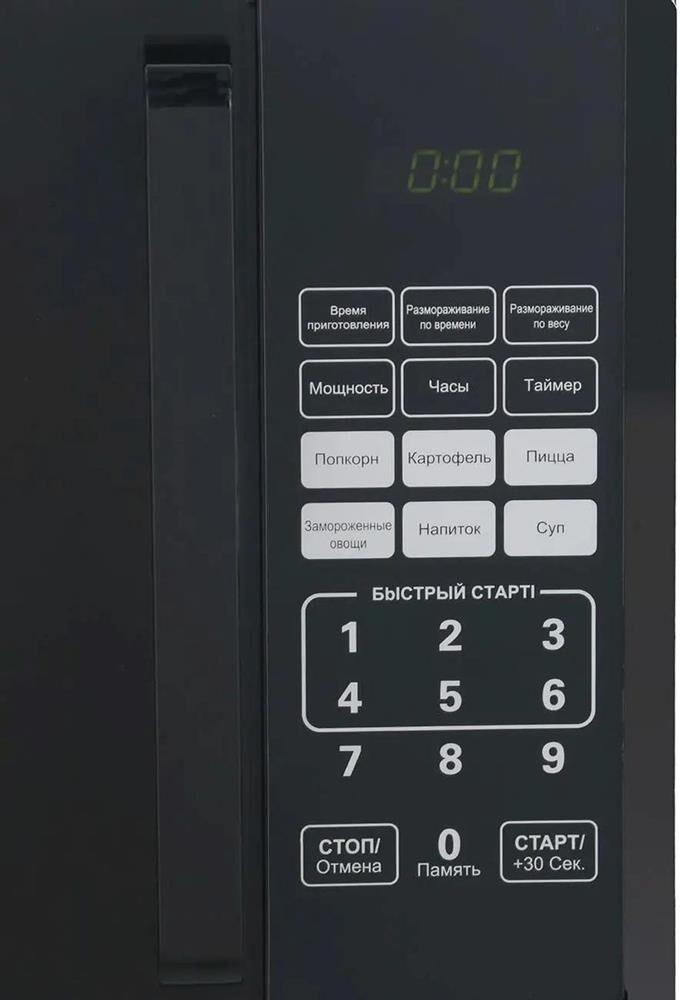 23 литра, 800 Вт, сенсорное управление, LED дисплей, цвет: чёрный ; 10 уровней мощности, меню автоматических программ, функция разморозки по весу или по времени, быстрый старт, часы, сигнал окончания приготовления, таймер, функция защитной блокировки, механизм открывания дверцы: ручка