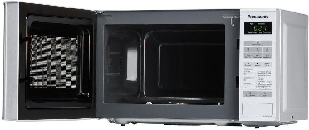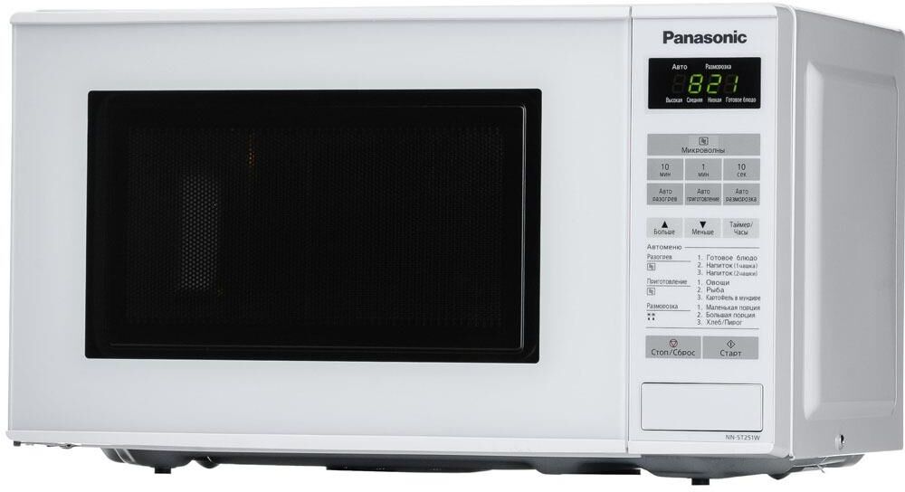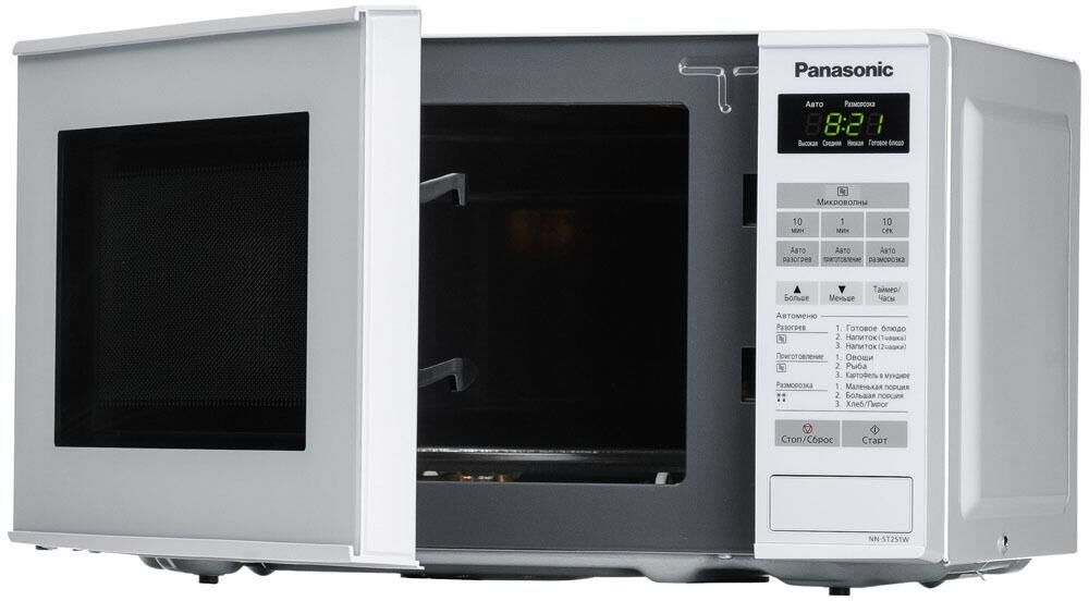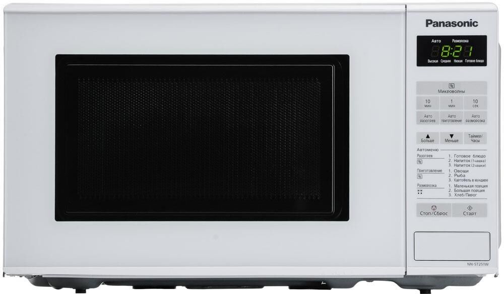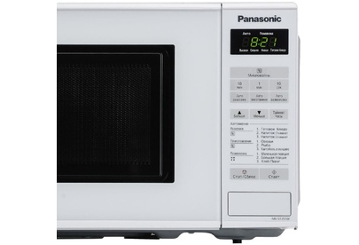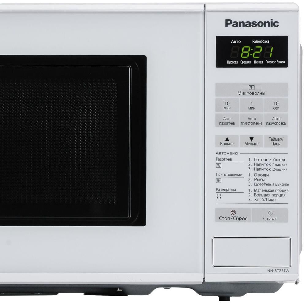 PANASONIC NN-ST251WZPE мощ. 800Вт, объем 20 литров, авто. 6 поп-ных русских блюд, тurbo разморозка, диам. 255 мм, внут. покрытие из жар.прочной эмали, ЖК дисп., сенсор. панель упр-ния, таймер блокировка от детей, книга рецептов на русском яз., Цвет:белый
