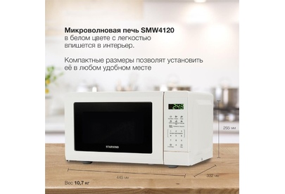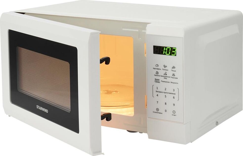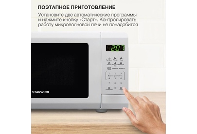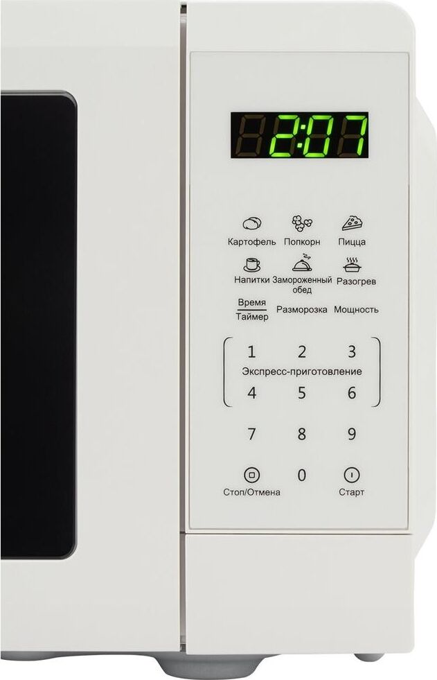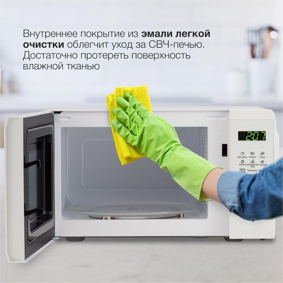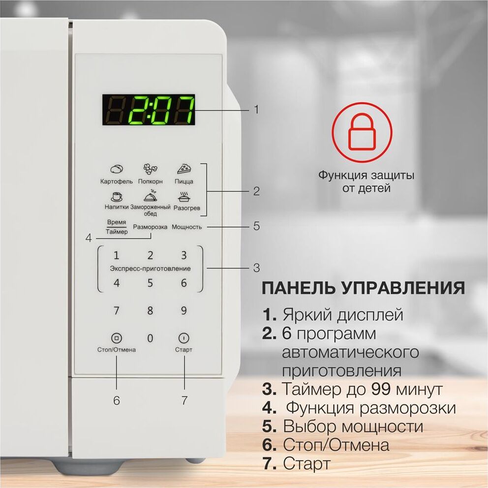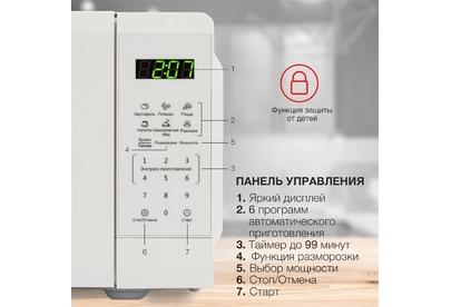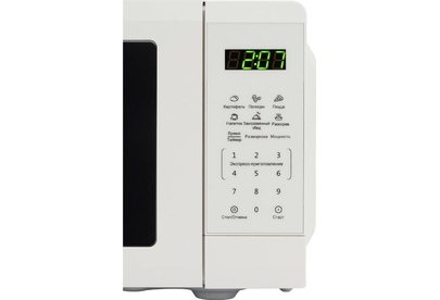 Мощность микроволн 700 Вт Объем 20л 11 уровней мощности Электронное управление Наличие дисплея Автоматическая разморозка Экспресс-режим приготовления Блокировка от детей Цвет белый Срок гарантии 12 мес