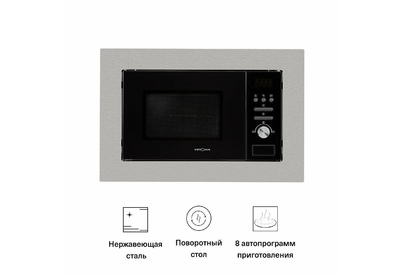 Мощность гриля, кВт: 1 Цвет: Нержавеющая сталь + Черное стекло Полезный объем, л: 20 Материалы: нержавеющая сталь + стекло Линейка: OPTIMA Срок службы: 7 лет Преимущества: * 8 рецептов автоприготовления * Разморозка по весу / по времени * Электрический гриль Ширина встраивания, мм: 600 Встраиваемая часть (В*Ш*Г), мм: 375*463*324 Ниша для встраивания (В*Ш*Г), мм: 382*568*340 min Лицевая панель (В*Ш*Г), мм: 388*595*20 Тип микроволновки: встраиваемая Управление: кнопки и поворотный переключатель Таймер: электронный, 1-95 мин. Часы: электронные Защита от детей: да Дисплей: да Освещение: есть Размораживание: да Звуковой сигнал: да Тип гриля: электрический Решетка для гриля: да Открытие дверцы: кнопка Мощность микроволн, Вт: 800 Автопрограммы микроволновки: Картофель Поворотный стол: есть, диаметр 245 мм Покрытие камеры: нержавеющая сталь Вид: полновстраиваемая Модель: ARGENTO Объем упаковки, м3: 0.12 Количество ступеней мощности: 5 Защитное отключение: да Тип: Микроволновые печи Количество рецептов автоприготовлен