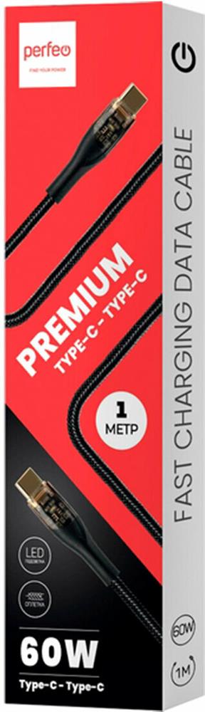 PERFEO (C1102) USB C вилка - C вилка, 60W, нейлон, черный, длина 1 м., PREMIUM