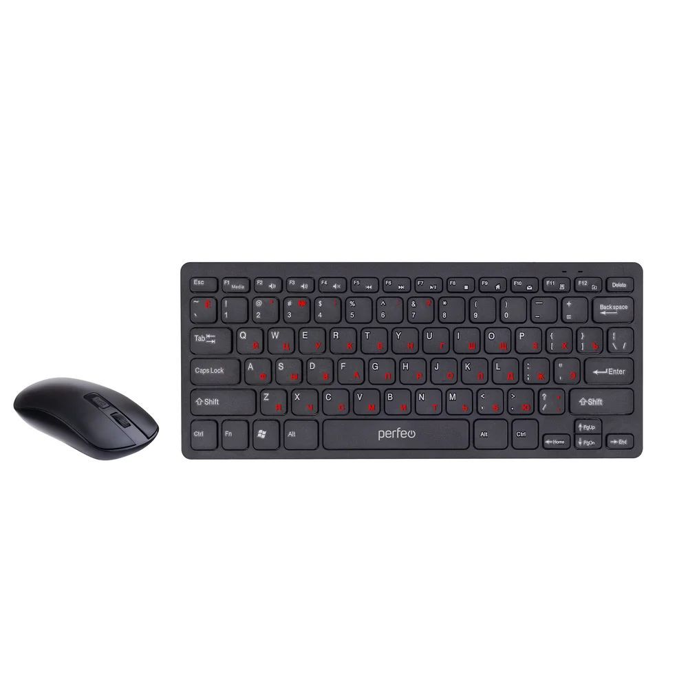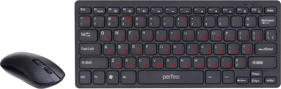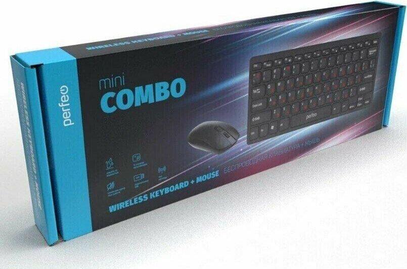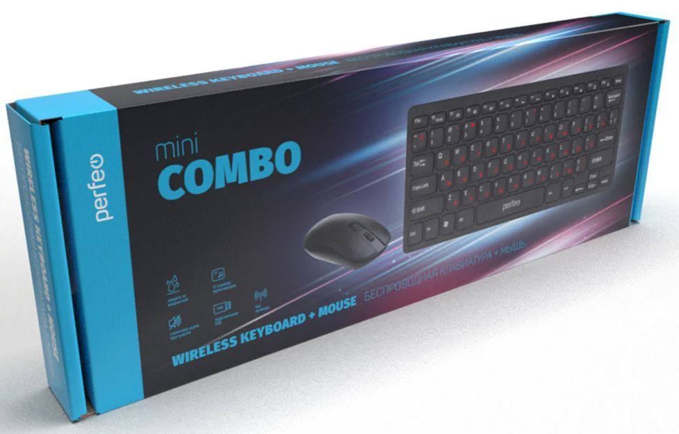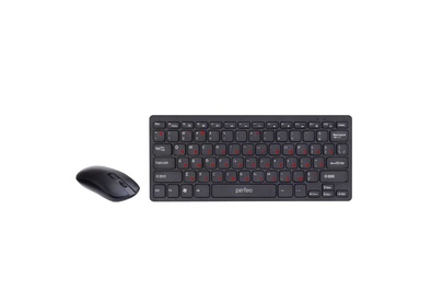 Набор (клавиатура+мышь) беспроводной, интерфейс USB; клавиатура - количество клавиш - 78, функциональных - 12; мышь - оптическая, количество кнопок - 4, колесо прокрутки, изменяемое разрешение сенсора - 1000/1200/1600 dpi, радиус действия - до 10 м.