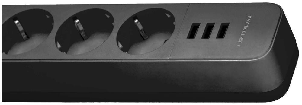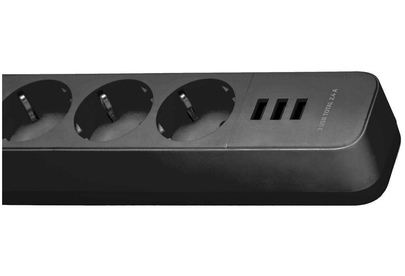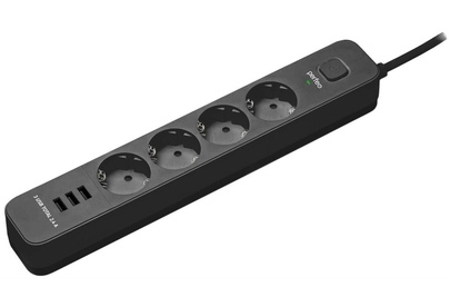 Сетевой фильтр 4 евророзетки и 3 USB порта на 2.4A, Длина 2м, Номинальный ток 10А, Максимальная нагрузка 2500Вт, Варисторная защита и защитные шторки для детей. Есть крепление на стену.
