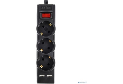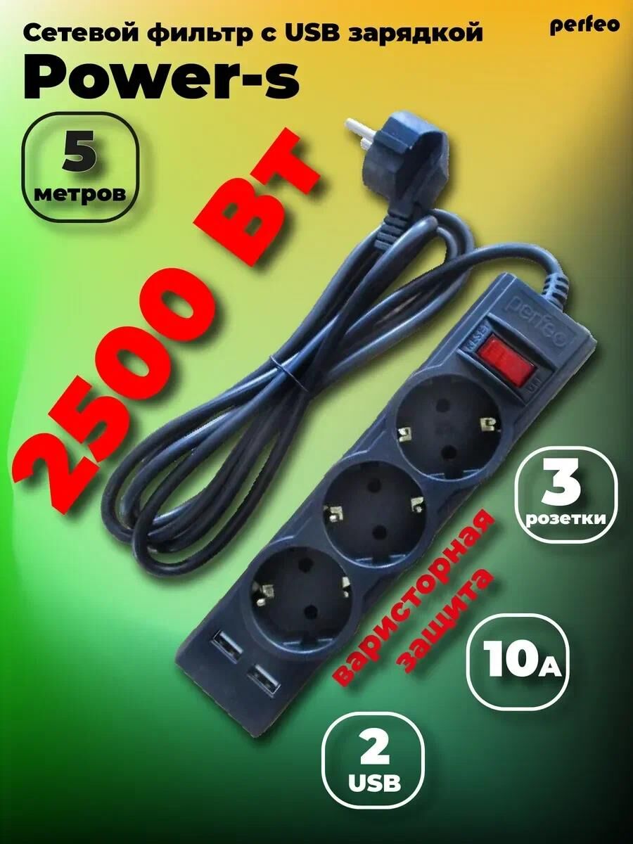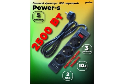 PERFEO (PF_E1643) "POWER-S", 5,0м, 3 розетки 10А, 2USB, 2500 Вт, двойная защита, черный