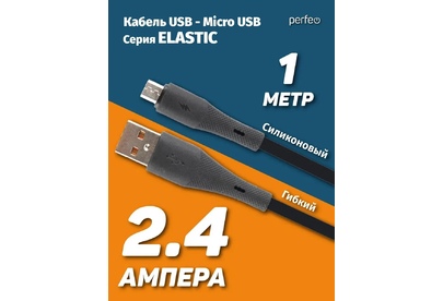 PERFEO (U4028) ELASTIC USB A вилка - Micro USB вилка, 2.4A, черный, силикон, длина 1 м