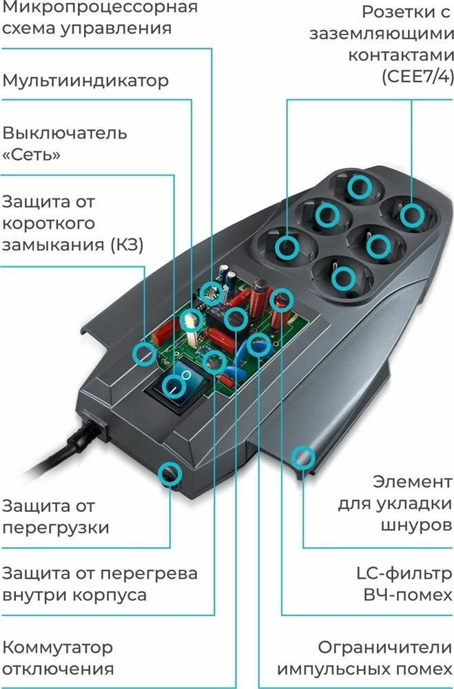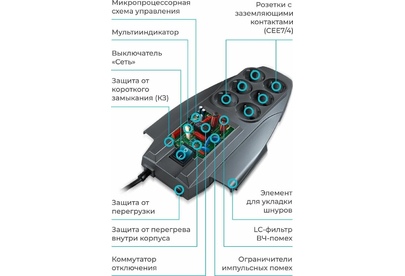 Входная вилка, тип: EURO. Длина шнура: 3. Номинальный ток: 10. Номинальное напряжение питающей сети: 220. Частота сети: 50. Максимальный импульсный ток помехи: 30000. Подавление импульсных помех: да. Подавление высокочастотных помех: да. Индикация исправности защиты: Да. Защита от короткого замыкания: есть. Защита от перегрева: есть. Количество выходных розеток: 6. Габариты упаковки (ед) ДхШхВ: 0.18x0.08x0.39. Вес упаковки (ед): 1.16. Гарантия: 60 мес.. Цвет: серый. Длина шнура: 3 м. Входная вилка: EURO. Количество выходных розеток: 6