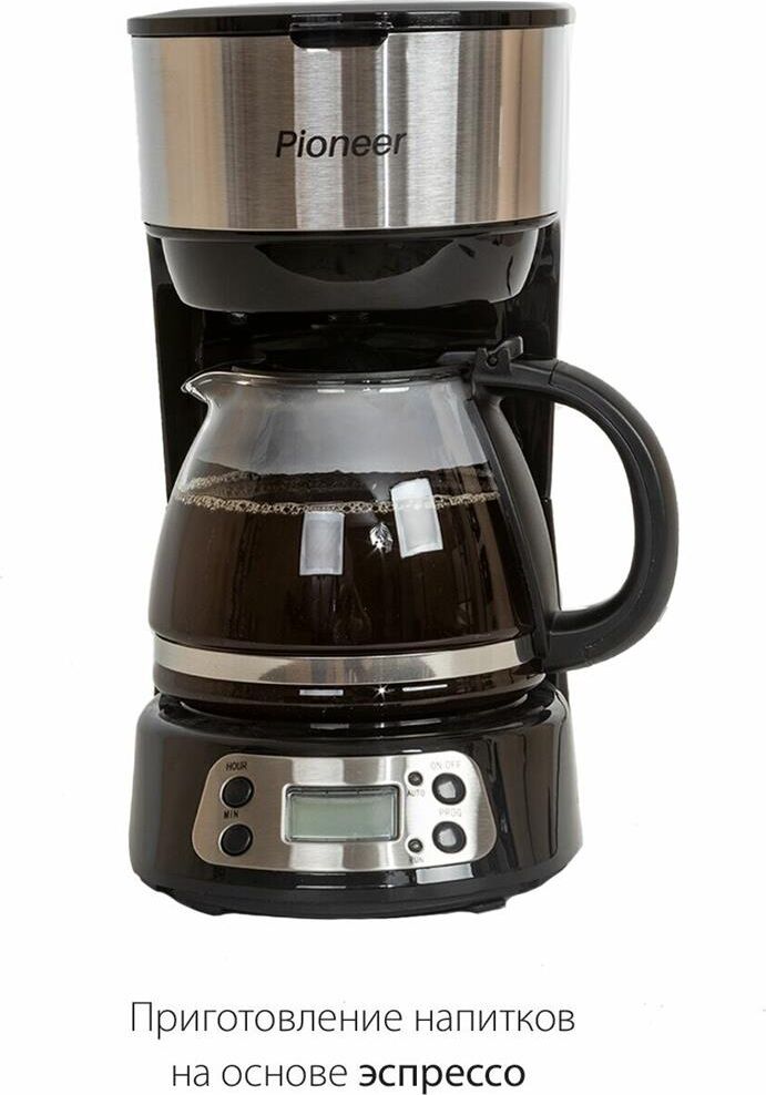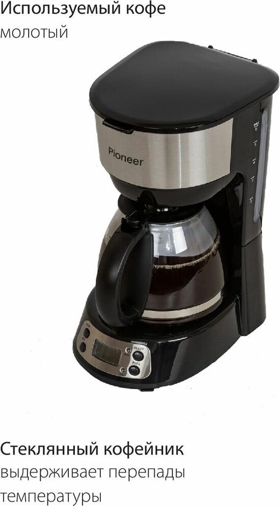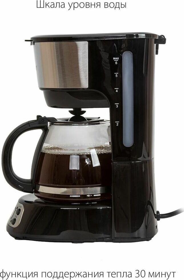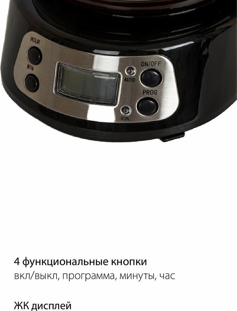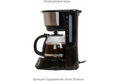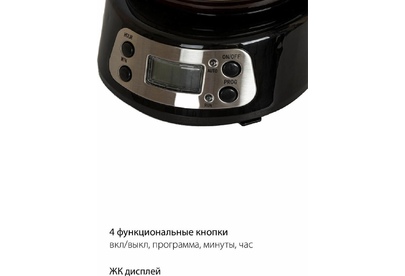 Кофеварка капельного типа, мощность 600Вт, емкость для воды 0,75 л, время заваривания: менее 8 минут, противокапельная система: 30-секундная защита от капель, нейлоновый фильтр, цифровое управление, ЖК-дисплей, подсветка, автоматическое отключение, функция поддержания температуры кофе, колба из термостойкого стекла