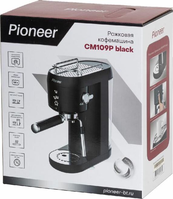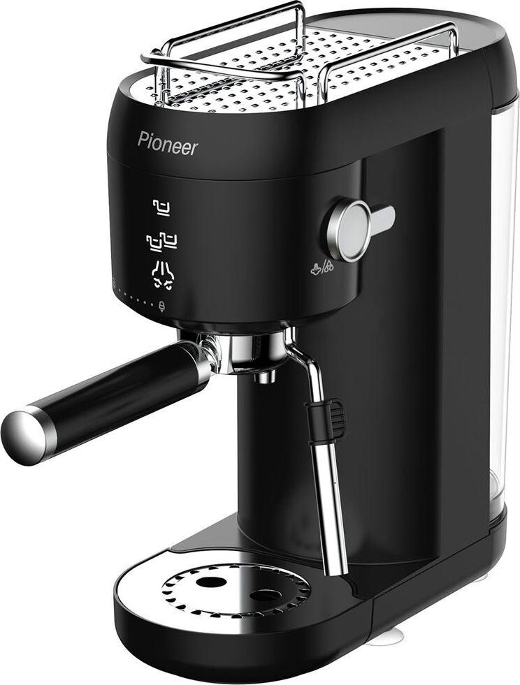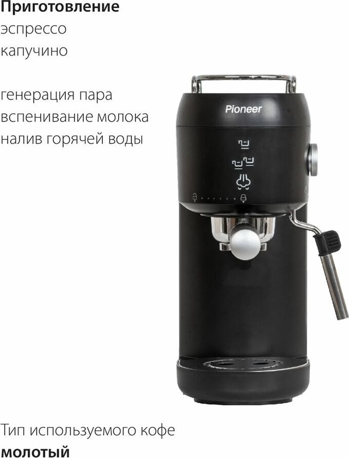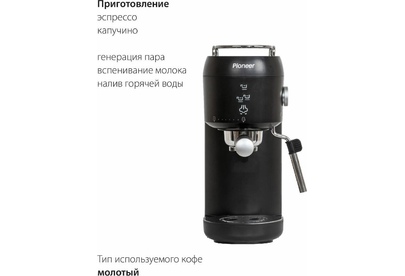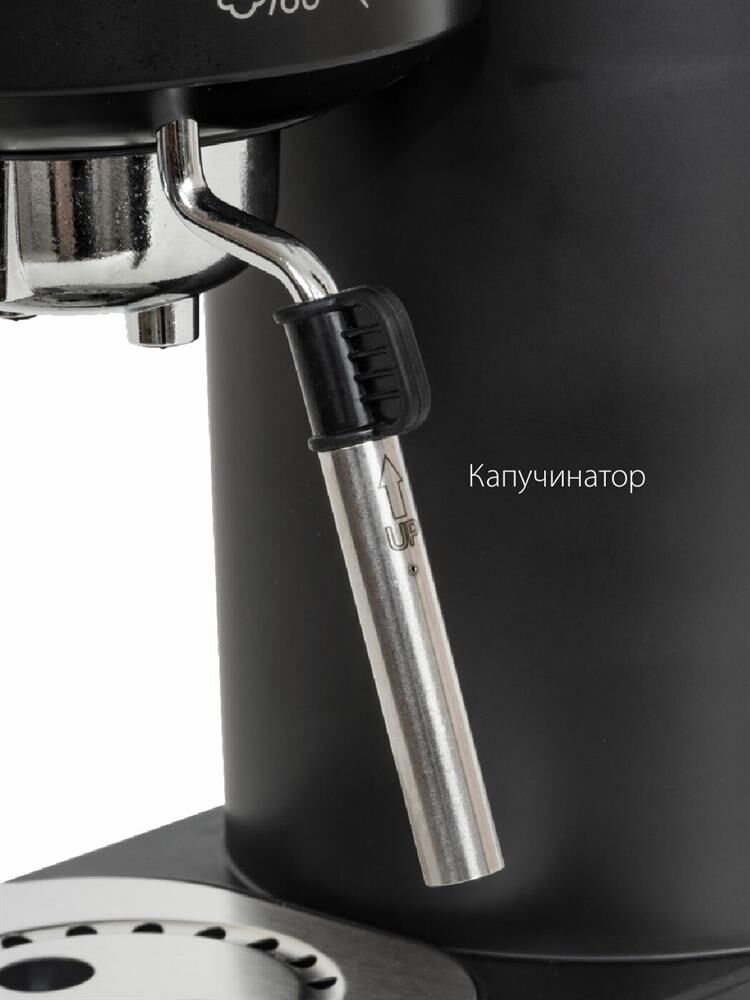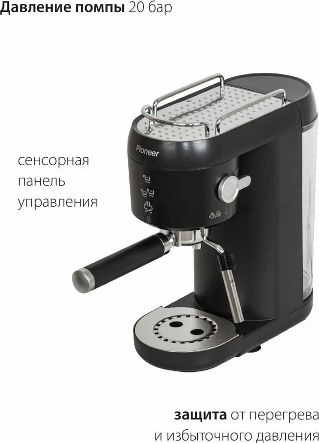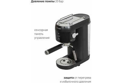 Кофеварка рожкового типа, Мощность 1400 Вт, Съемный резервуар для воды объемом 1,0 л, Помпа высокого давления 20 бар, Съемный стимер из нержавеющей стали, Сенсорное управление, Система быстрого нагрева термоблока для быстрого заваривания, Защита от перегрева и избыточного давления, Регулировка объема напитка, Съемный поддон для сбора капель объемом 170 мл, Подогрев кофейных чашек, Точный контроль температуры, Автоматическое отключение, Противоскользящие резиновые ножки, Фильтры на одну и на две чашки