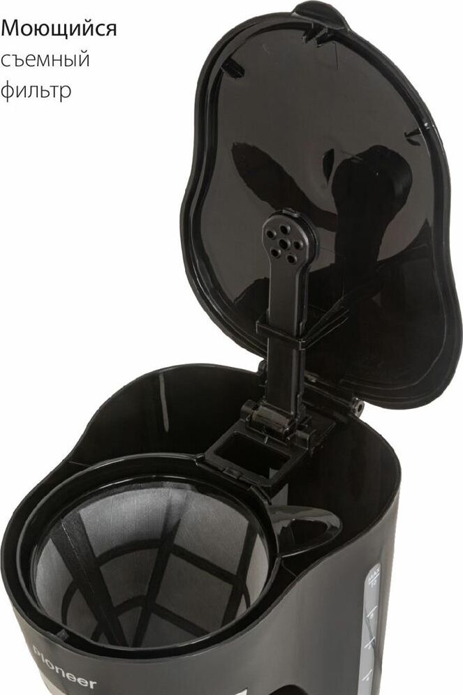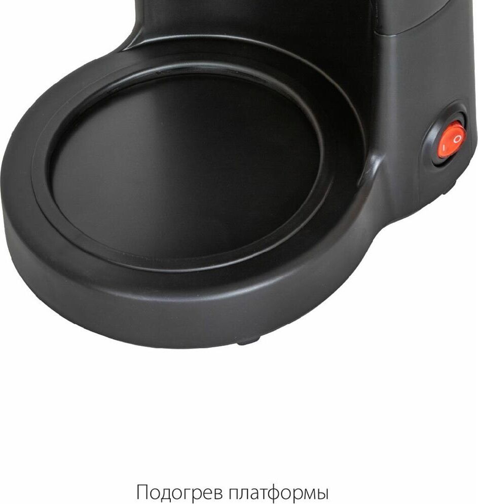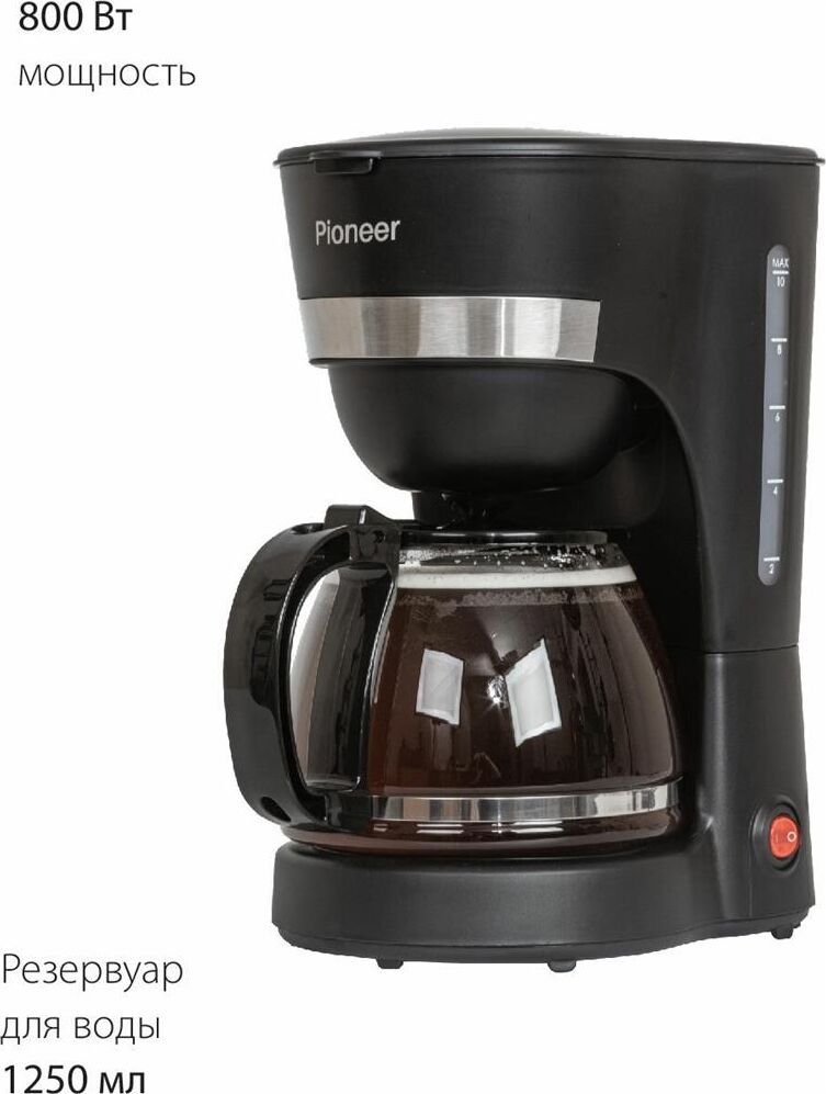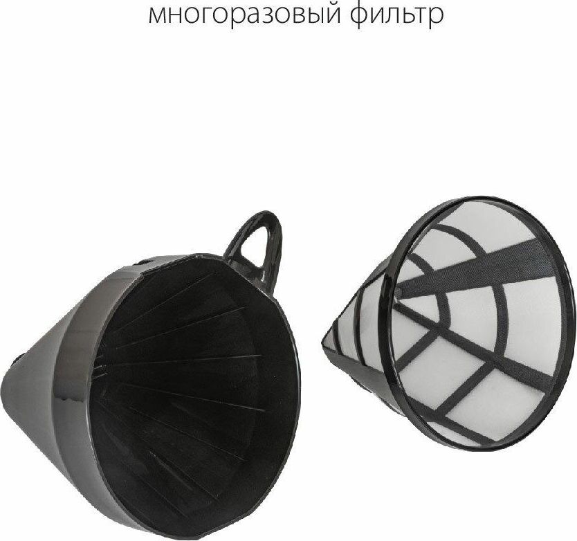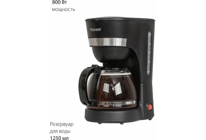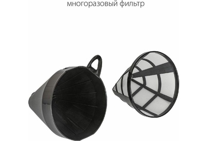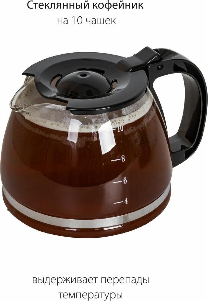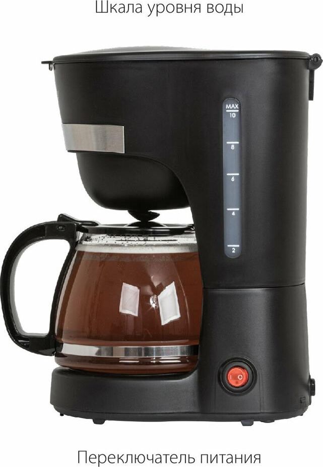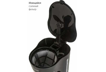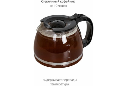 Емкость резервуара для воды 1,25 л Стеклянный кофейник, устойчивый к высоким температурам Подогрев готового кофе Съемный моющийся фильтр Индикатор уровня воды Противокапельная система Защита от перегрева 220-240 В ~ 50 Гц, 800 Вт