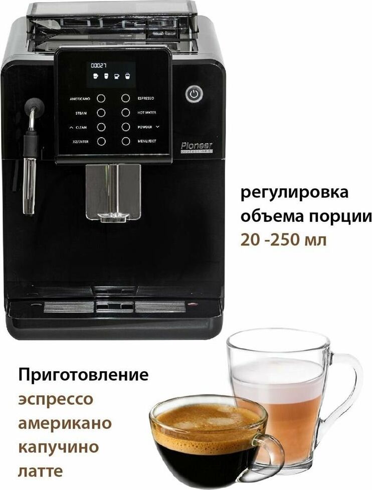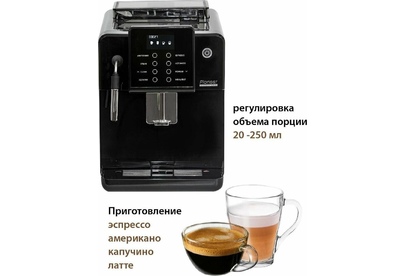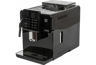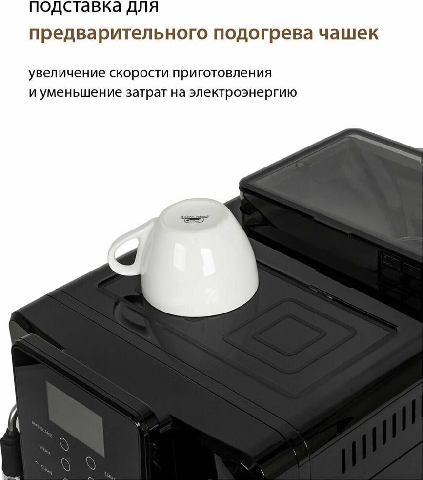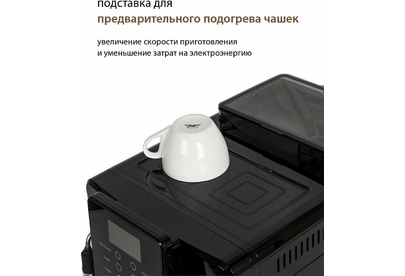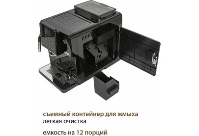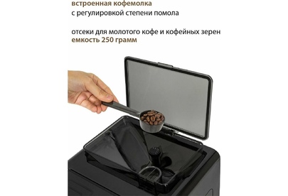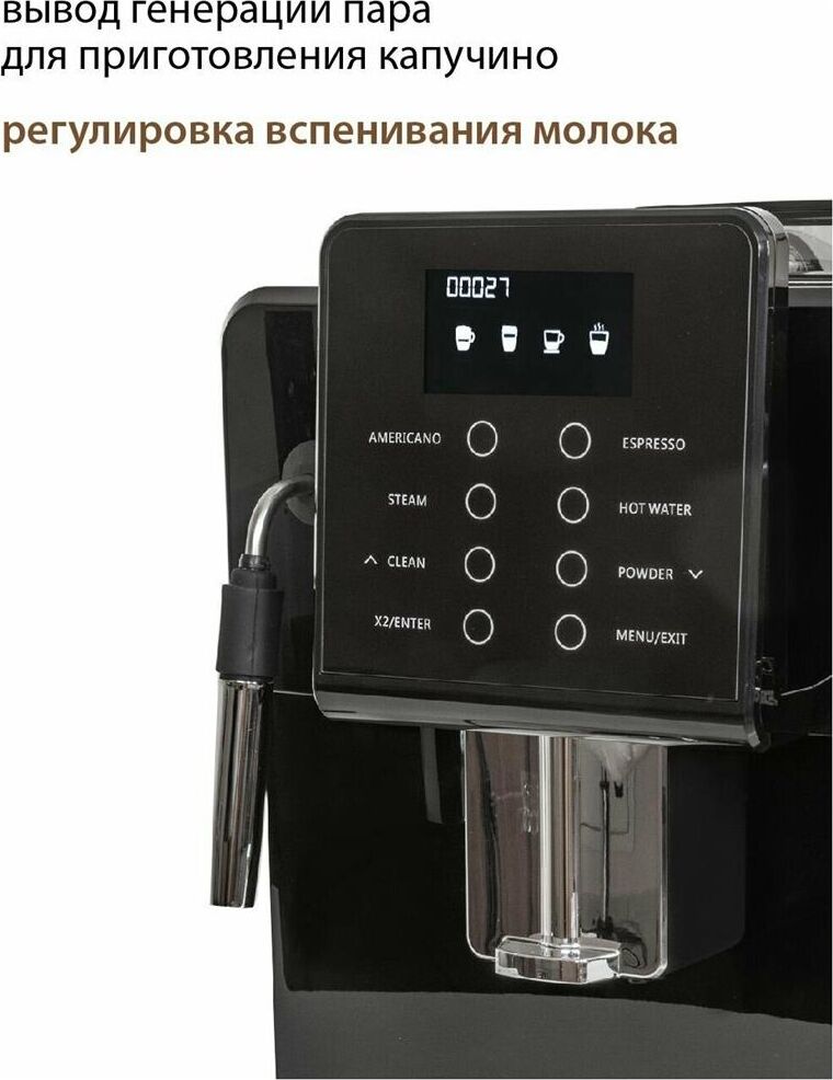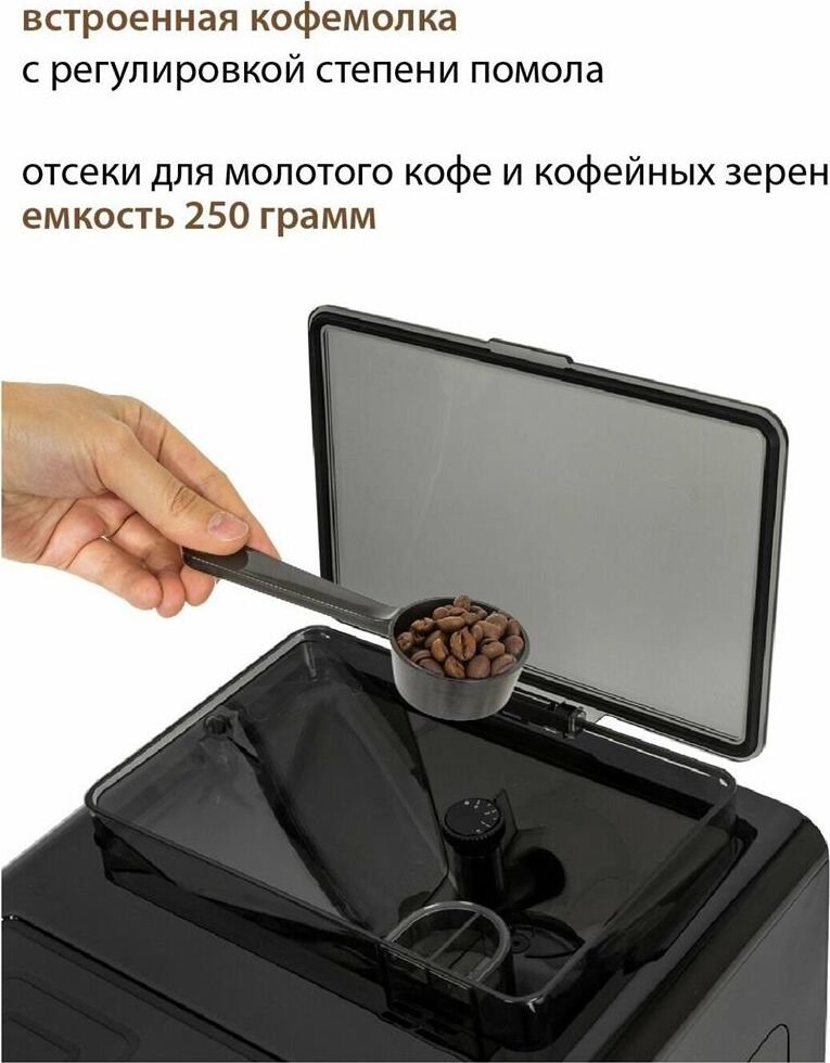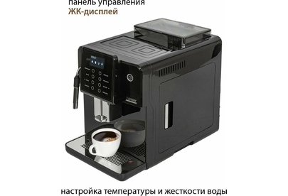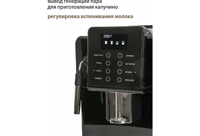Кофемашина для автоматического приготовления американо и эспрессо со встроенной кофемолкой. Мощность 1350 Вт. Интуитивно понятный многофункциональный ЖК-дисплей с сенсорными кнопками управления. Вывод генерации пара для приготовления капучино. Настройка крепости и температуры. Емкость контейнера для зерен: 250 грамм. Регулировка степени помола кофе от 1 до 5. Регулировка объема порции кофе от 20 до 250 мл. Регулировка высоты диспенсера: 70–130 мм (95–145 мл). Съемный резервуар для воды. Съемный варочный узел для легкой очистки. Счетчик порций. Резервуар для воды: 1,7 литра. Давление помпы ARS (Италия): 19 Бар. Емкость контейнера для отработанного кофе:12 порций. Автоматическая подача воды в резервуар. Индикация работы, пополнения воды и кофейных зерен, необходимости очистки от накипи. Цвет: черный