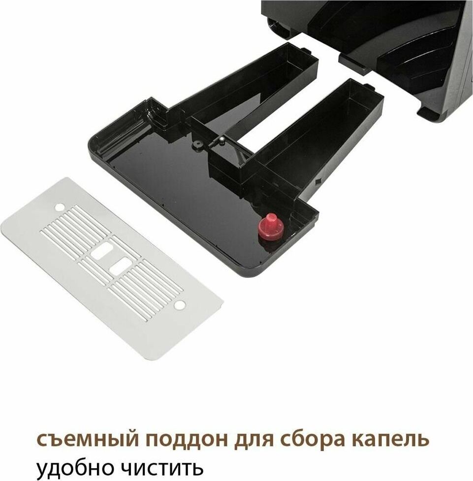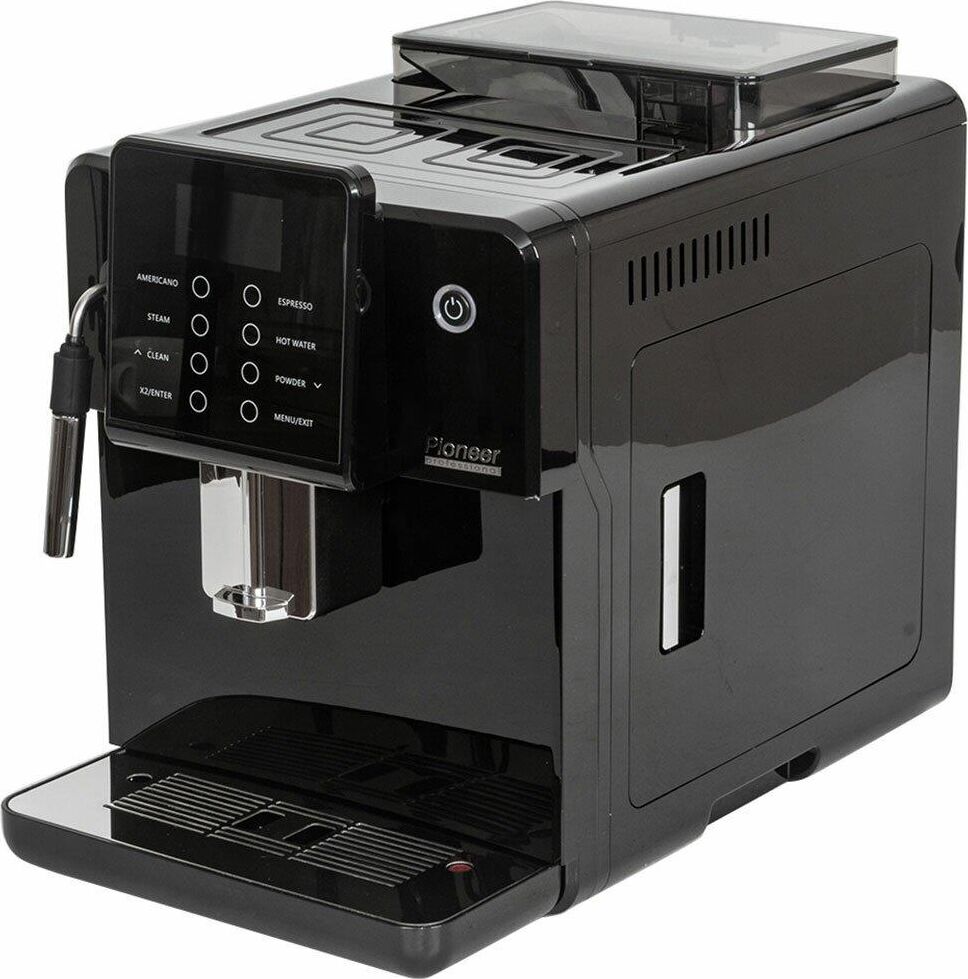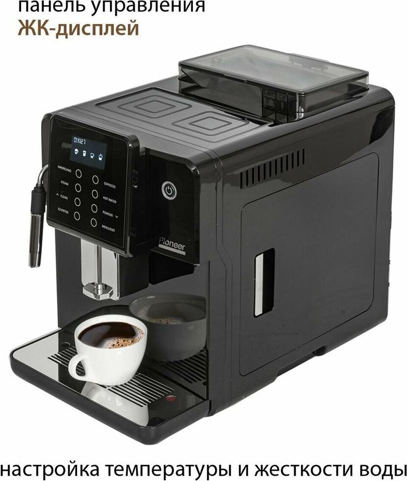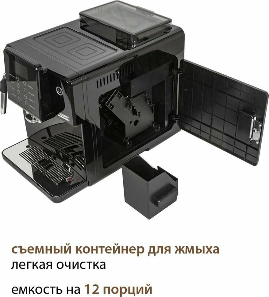 Кофемашина для автоматического приготовления американо и эспрессо со встроенной кофемолкой. Мощность 1350 Вт. Интуитивно понятный многофункциональный ЖК-дисплей с сенсорными кнопками управления. Вывод генерации пара для приготовления капучино. Настройка крепости и температуры. Емкость контейнера для зерен: 250 грамм. Регулировка степени помола кофе от 1 до 5. Регулировка объема порции кофе от 20 до 250 мл. Регулировка высоты диспенсера: 70–130 мм (95–145 мл). Съемный резервуар для воды. Съемный варочный узел для легкой очистки. Счетчик порций. Резервуар для воды: 1,7 литра. Давление помпы ARS (Италия): 19 Бар. Емкость контейнера для отработанного кофе:12 порций. Автоматическая подача воды в резервуар. Индикация работы, пополнения воды и кофейных зерен, необходимости очистки от накипи. Цвет: черный