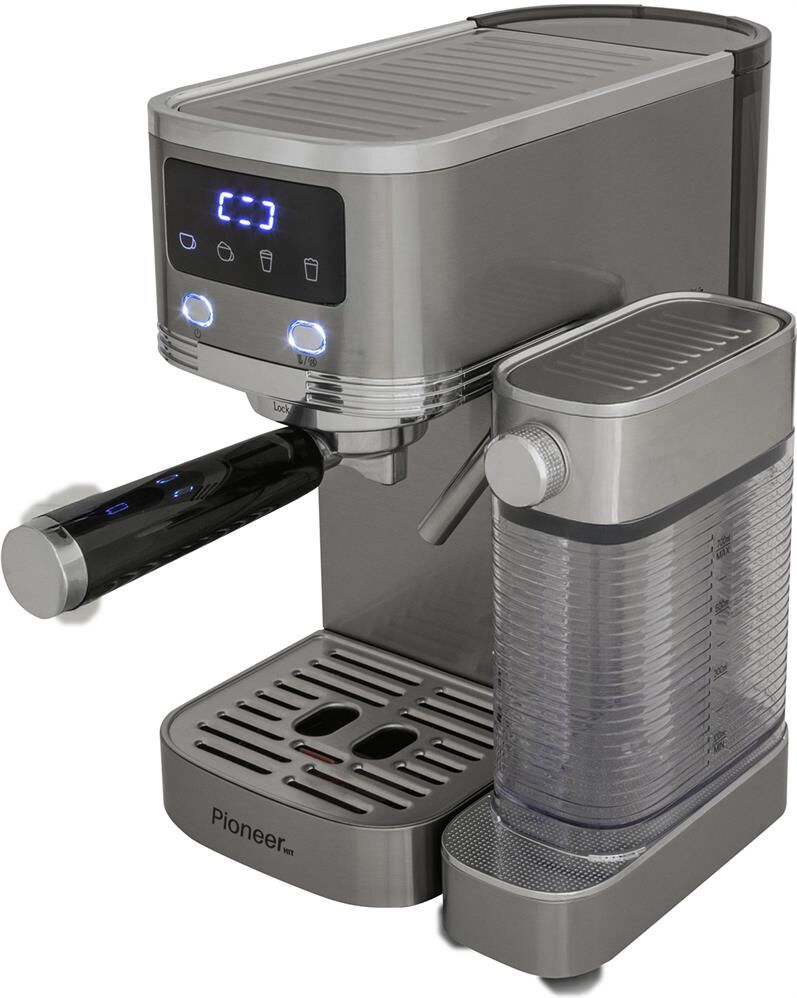 Кофеварка рожковая c автоматическим капучинатором, Профессиональная итальянская помпа ULKA на 20 бар, Приготовление эспрессо, капучино и латте одним касанием, Съемный контейнер для молока объемом 700 мл, Съемный резервуар для воды объемом 1,3 л, Цифровой дисплей: отображение времени и температуры, Мощность 1350 Вт, Система мгновенного нагрева термоблока для быстрого заваривания, Корпус из нержавеющей стали Защита от перегрева и избыточного давления, Регулировка объема напитка, Съемный поддон для сбора капель, Подогрев кофейных чашек, Точный контроль температуры, Автоматическое отключение, Противоскользящие резиновые ножки, Фильтры на одну и на две чашки.
