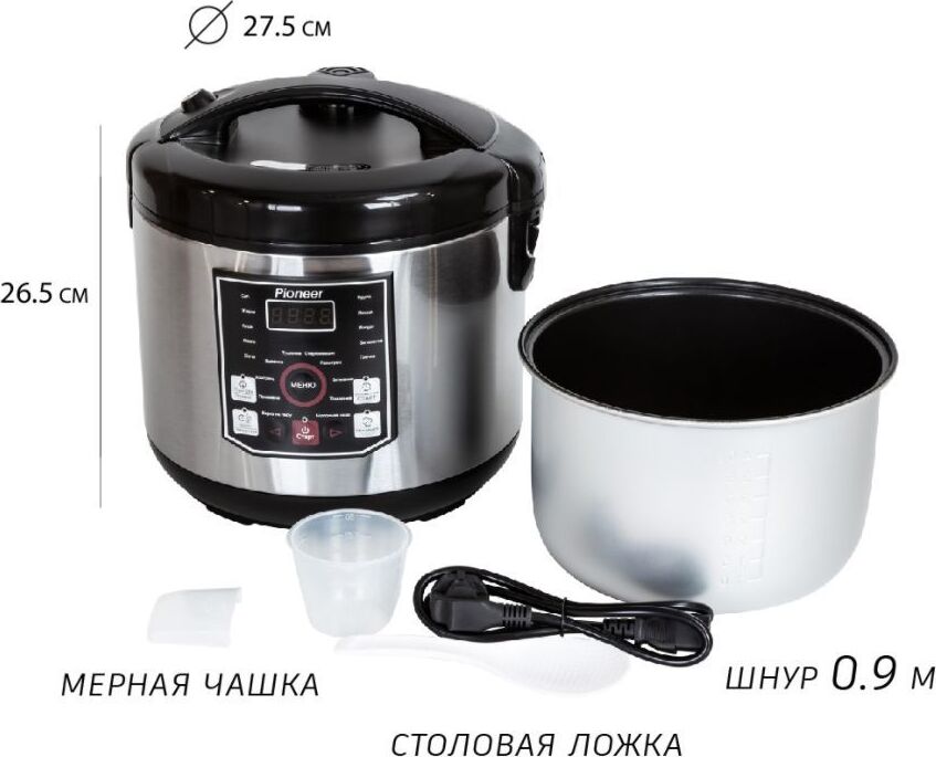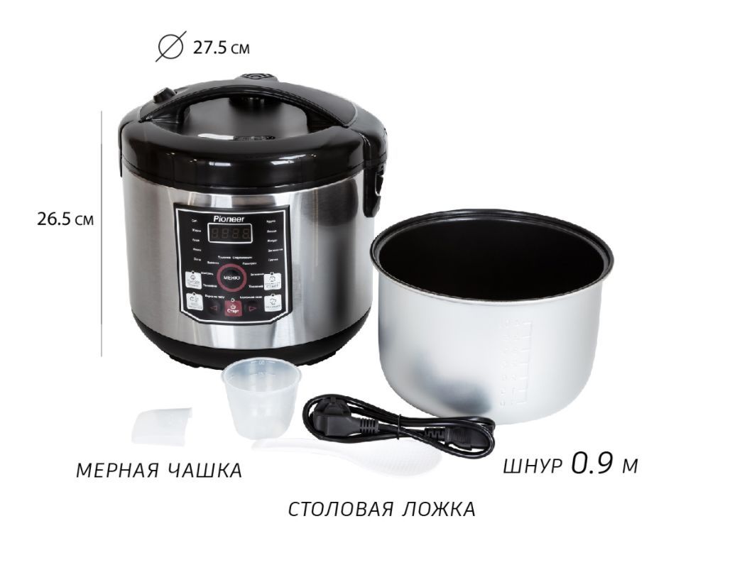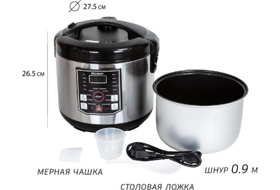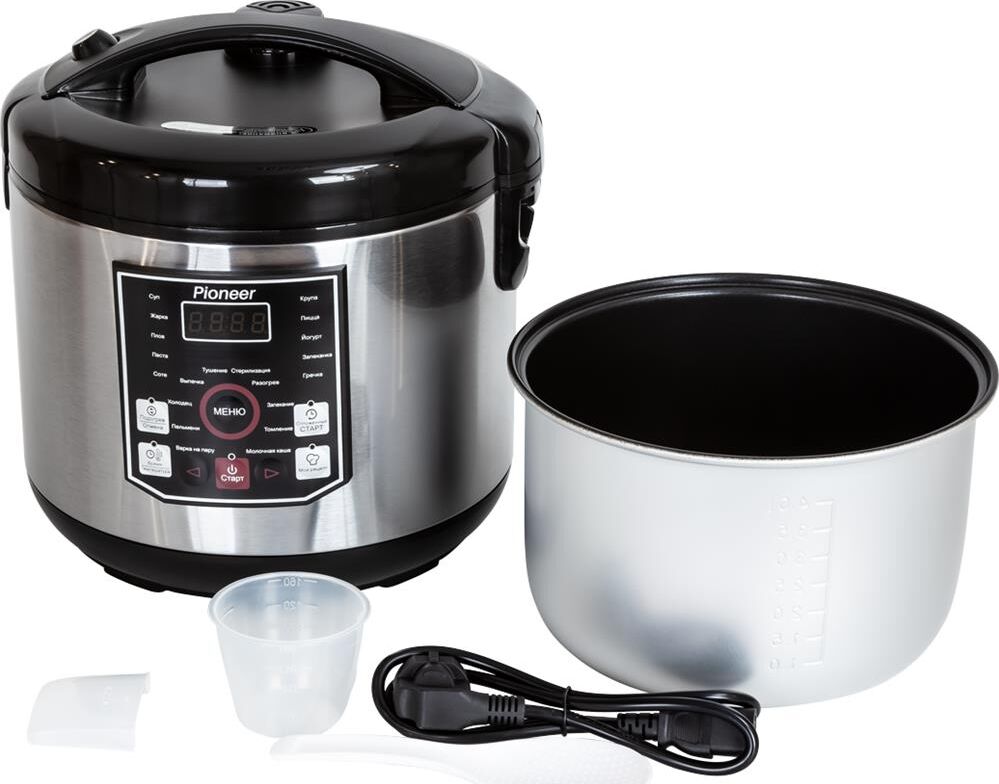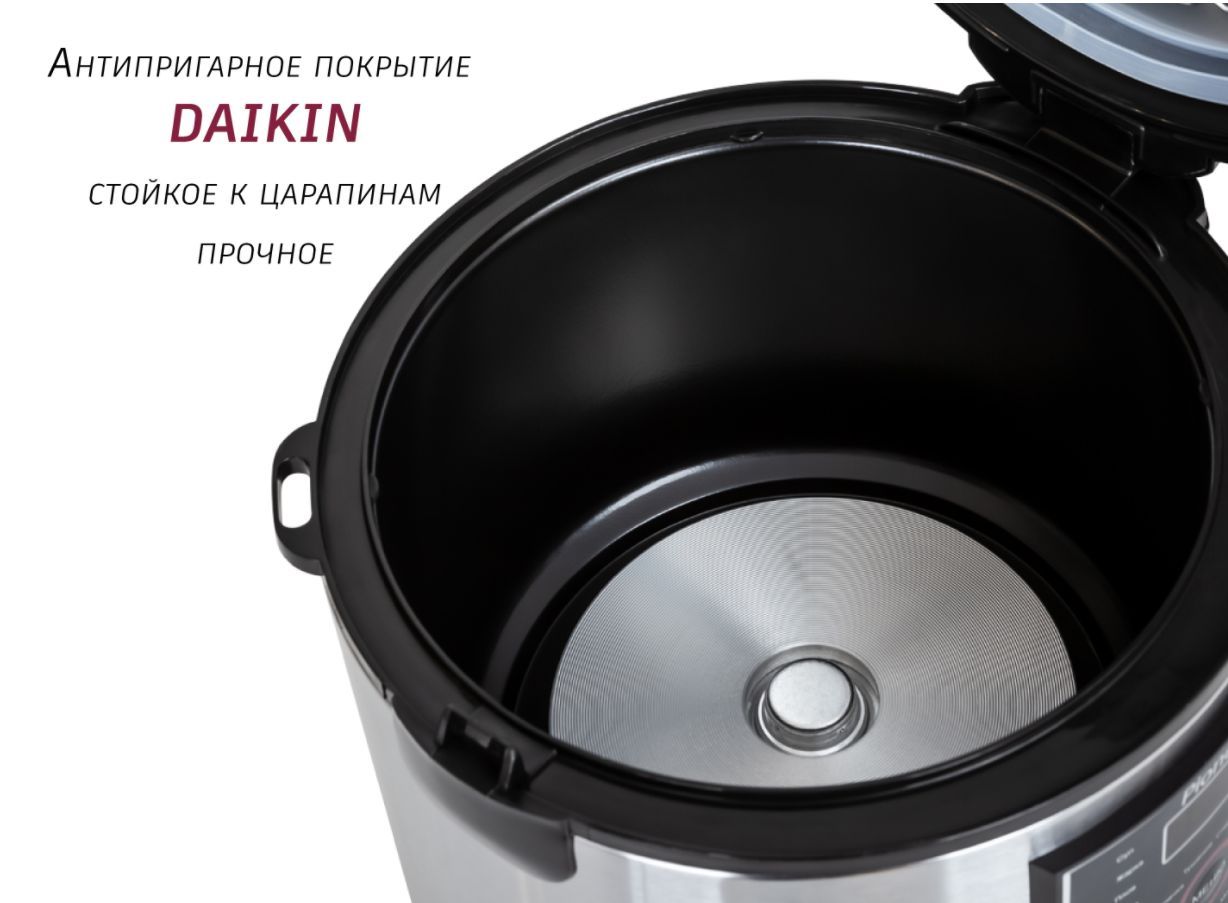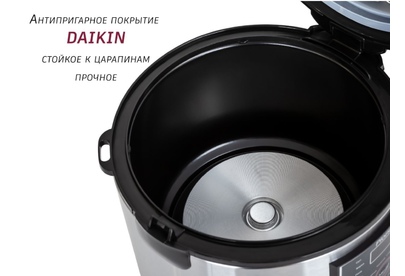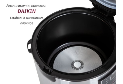 Мультиварка, мощность 860 ватт, объем чаши: 5 литров, 20 автоматических программ, более 200 режимов приготовления, светодиодный многофункциональный дисплей, поддержание температуры 24 часа, таймер отсрочки, антипригарное покрытие внутренней чаши DAIKIN – прочное и устойчивое к царапинам, книга рецептов