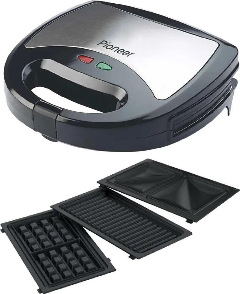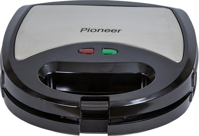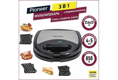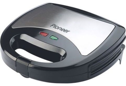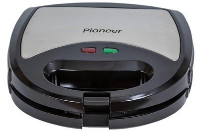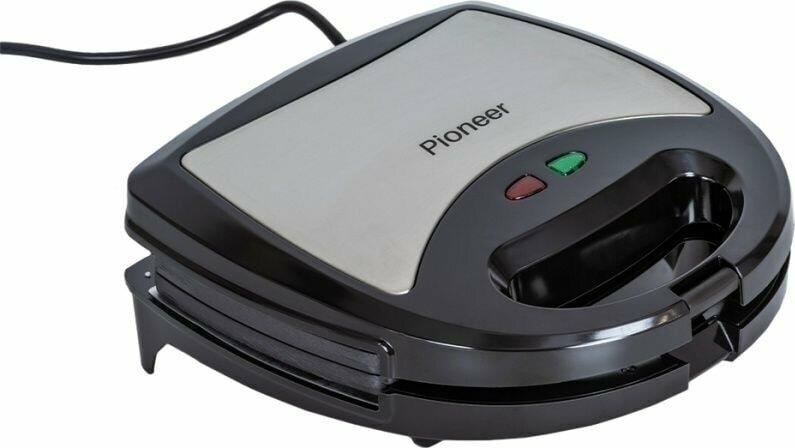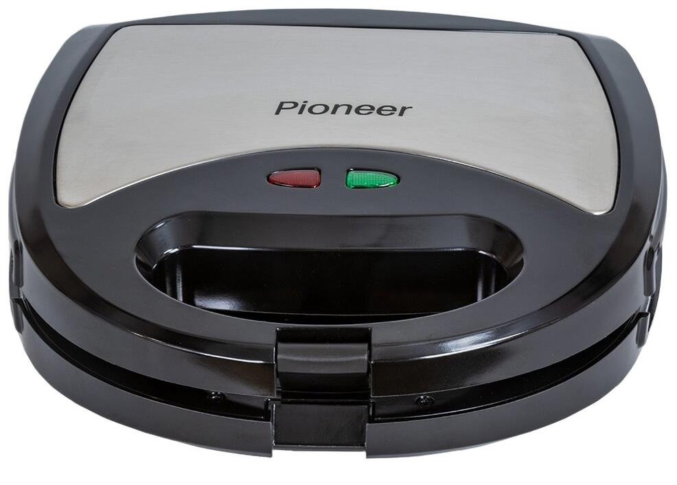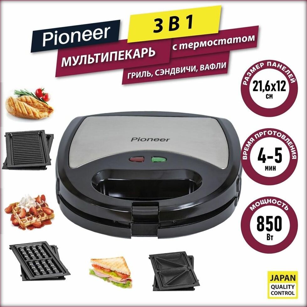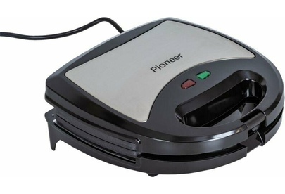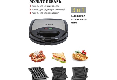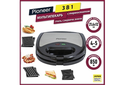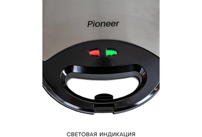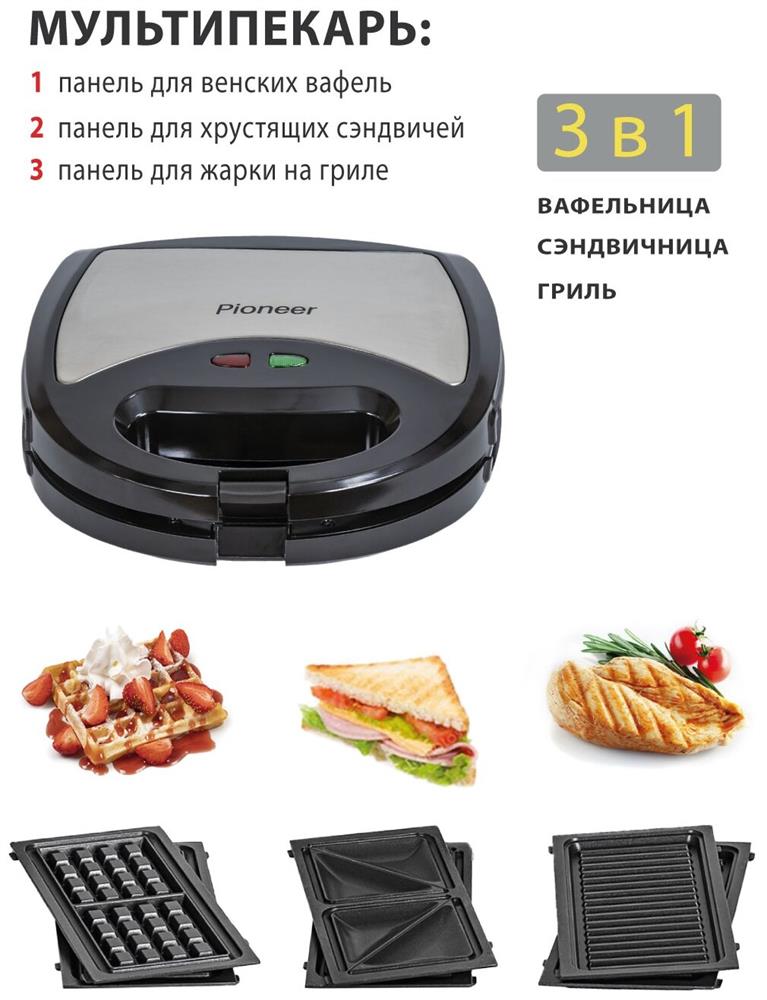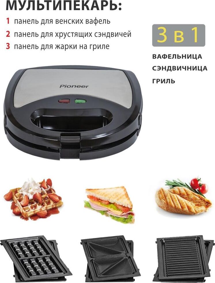 PIONEER SM302D Съемные нагревательные панели: есть Покрытие нагревательных панелей: антипригарное Ненагревающаяся ручка: есть Замок-фиксатор крышки: есть Индикаторы: работы, нагрева Комплектация: электрический гриль, панели-гриль, панели для сэндвичей, панель для венских вафель, гарантийный талон, инструкция на русском Материал корпуса: пластик, металл Цвет: серебристый с черным Максимальная потребляемая мощность, Вт.: 850 Дополнительная информация: термостат