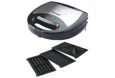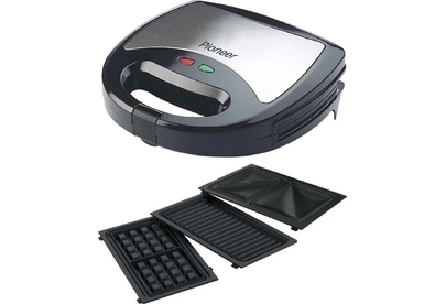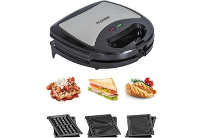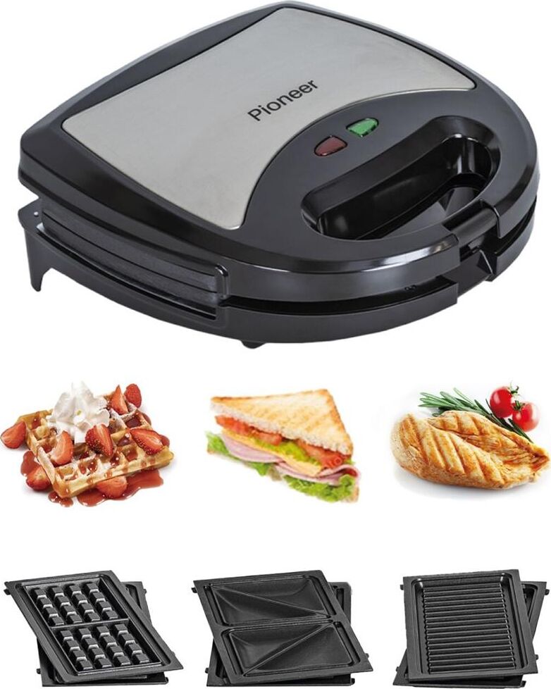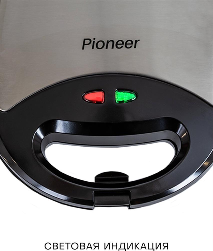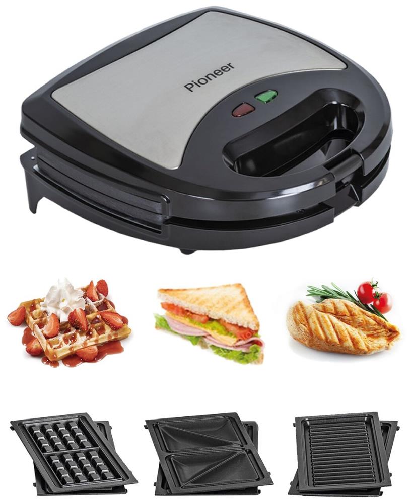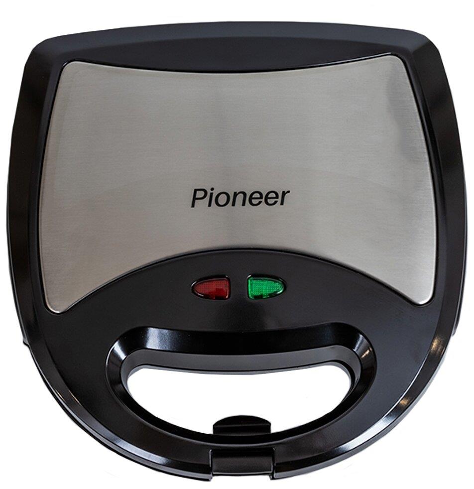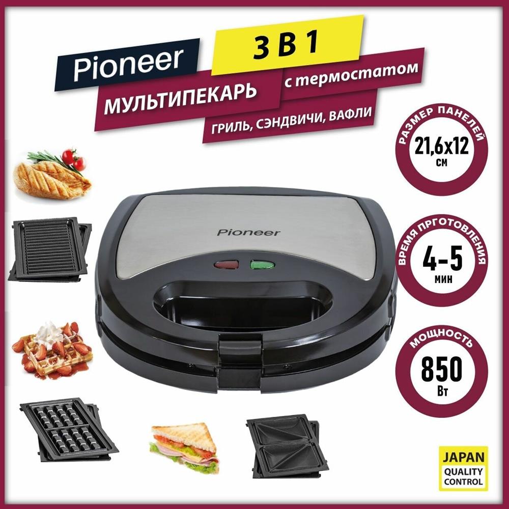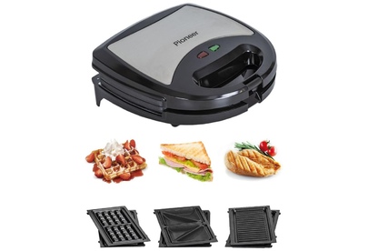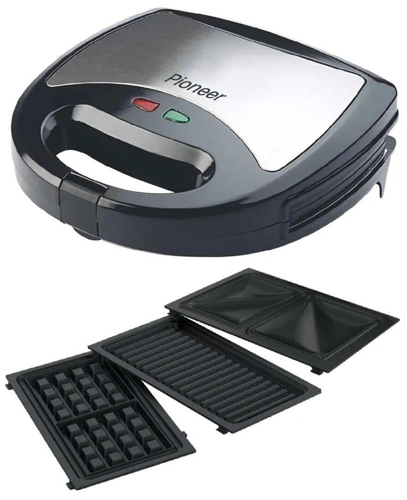 PIONEER SM302D Съемные нагревательные панели: есть Покрытие нагревательных панелей: антипригарное Ненагревающаяся ручка: есть Замок-фиксатор крышки: есть Индикаторы: работы, нагрева Комплектация: электрический гриль, панели-гриль, панели для сэндвичей, панель для венских вафель, гарантийный талон, инструкция на русском Материал корпуса: пластик, металл Цвет: серебристый с черным Максимальная потребляемая мощность, Вт.: 850 Дополнительная информация: термостат