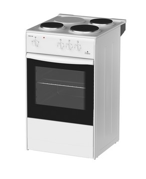 (ВхШхГ) 85х50х56см. 3 чугун. конфорки. Термостат, 5-позиционный переключатель режимов жарочного шкафа, ступенчатые переключатели режимов работы электроконфорок. Объем духовки 50л. 4 режима работы духовки. Решетка жароч. шкафа, поддон. Цвет белый.