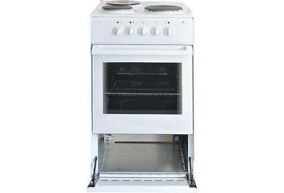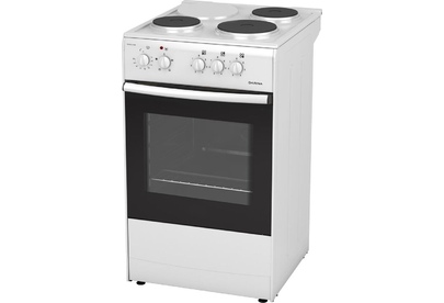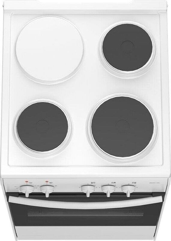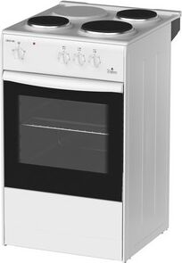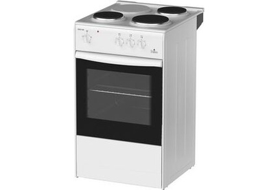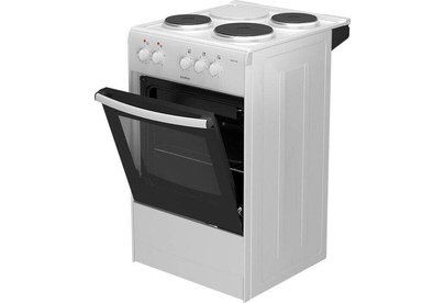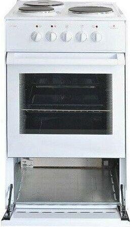 (ВхШхГ) 85х50х56см. 3 чугун. конфорки. Термостат, 5-позиционный переключатель режимов жарочного шкафа, ступенчатые переключатели режимов работы электроконфорок. Объем духовки 50л. 4 режима работы духовки. Решетка жароч. шкафа, поддон. Цвет белый.