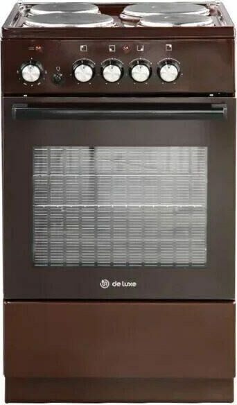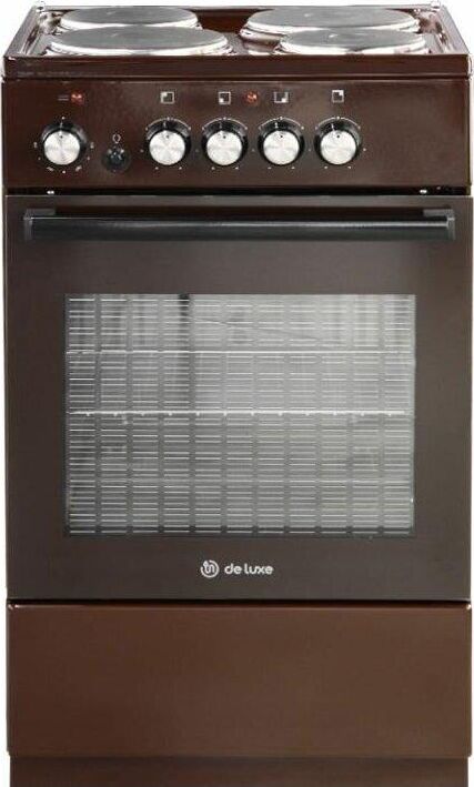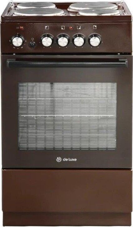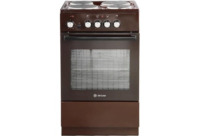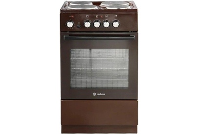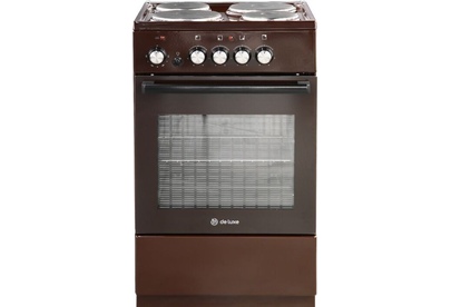 Размеры, мм - высота/ширина/глубина – 850/500/500 * Цвет - коричневый * 4 электрические конфорки 1,0/1,5/1,5/1,0 кВт * Объём духовки 43 л. * Большой противень * Малый противень * Решётка для жарки * Хозяйственный отсек *