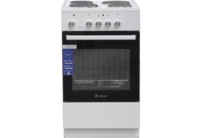 Размеры, мм - высота/ширина/глубина – 850/500/500 * Цвет - белый * 4 электрические конфорки 1,0/1,5/1,5/1,0 кВт * Объём духовки 43 л. * Большой противень * Малый противень * Решётка для жарки * Хозяйственный отсек *
