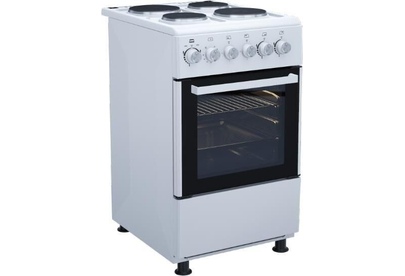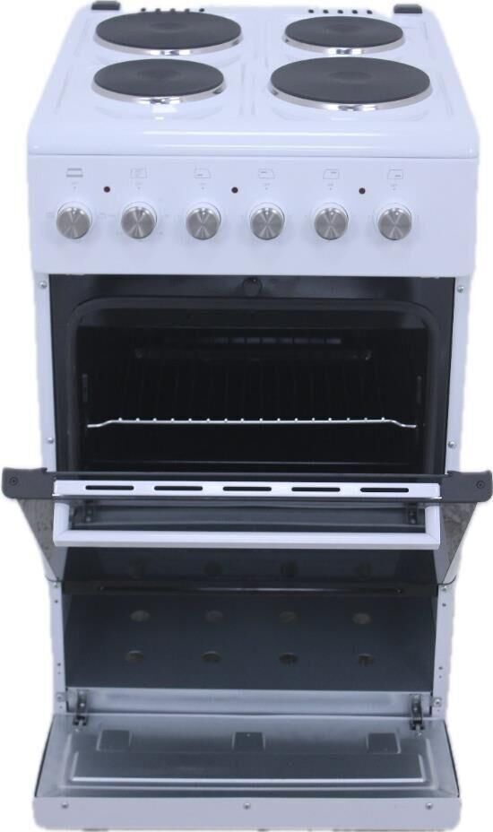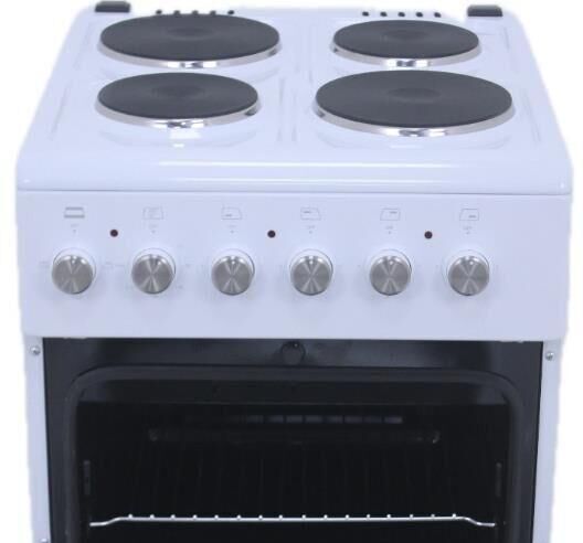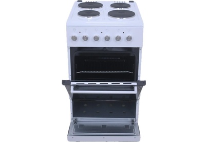 Плита отдельностоящая электрическая 50х60 см электрическая духовка, съемное внутреннее стекло (Cood Door), термостат, подсветка духовки, верхний,нижний тэн, 1 противень, 1 решетка, Рабочая поверхность (2 x o145 мм - 1200 Вт + 2 x O185 мм - 1500 Вт), нижний ящик для посуды, объём духовки 52 л. без крышки. В комплекте: кабель, регулируемые ножки. Цвет Белый. Упаковка картон.