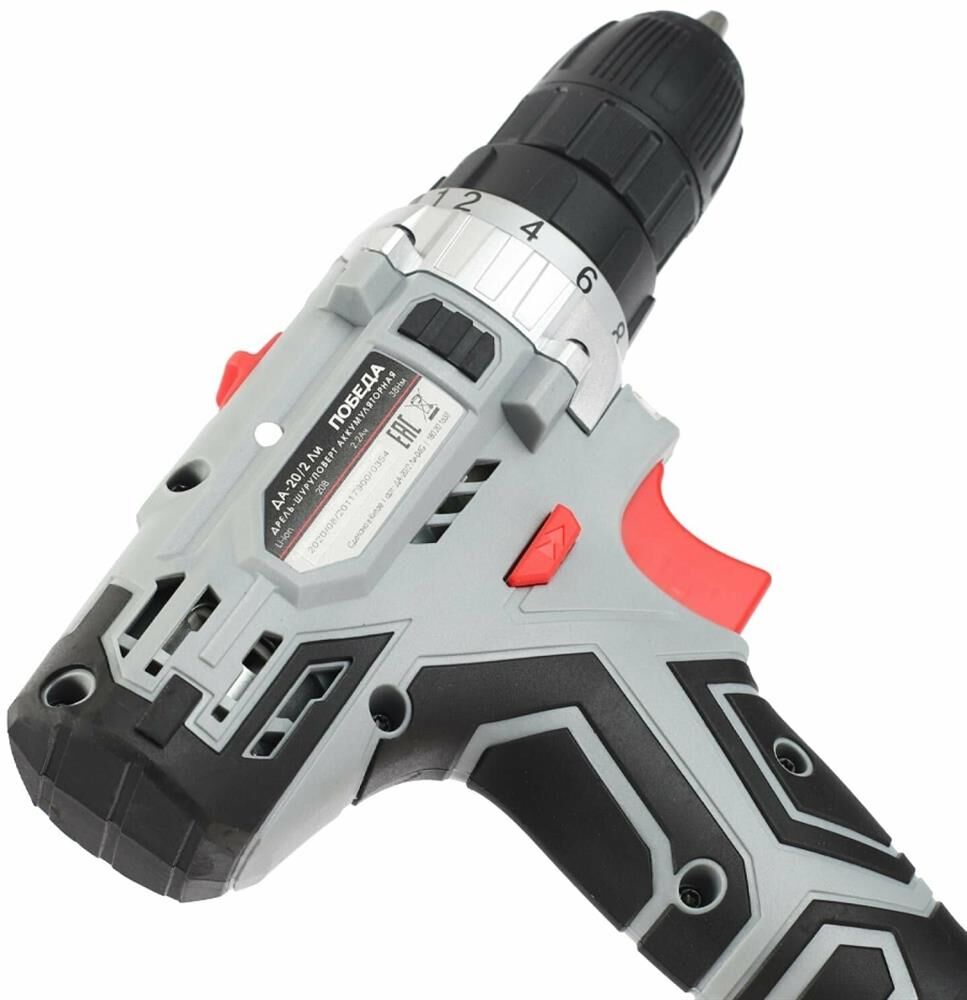 Напряжение аккумулятора: 20; Ёмкость аккумулятор: 2,2; Тип патрона: быстрозажимной; Диаметр патрона: 10; Кол-во скоростей: 2; 1 скорость: 0-400; 2 скорость: 0-1490; Кол-во регулировок крутящего момента: 18+1; Мягкий крутящий момент: 30; Жёсткий крутящий момент: 38; Реверс: +; Блокировка шпинделя: +; Быстрая зарядка: +; Подсветка рабочей зоны: +; Система защиты аккумулятора: +; Регулировка частота вращения: +; Кол-во аккумулятора в комплекте: 2