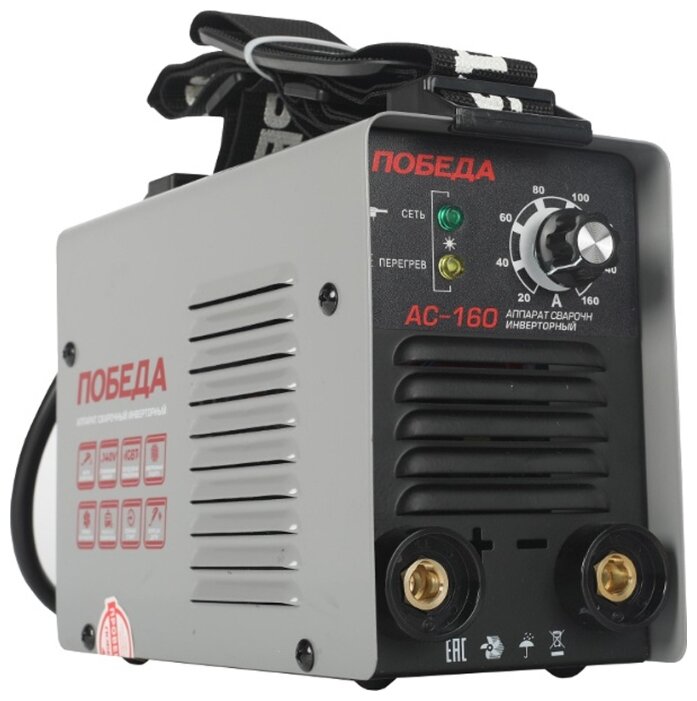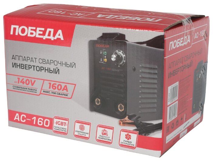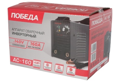 Сварочный аппарат инверторный, входное напряжение 1ф - 220В, потребляемая мощность - 3.9 кВА, сварочный ток мин/макс - 20/160А, ПВ-60%, диаметр электрода - 1.6/4 мм, комплектация: держатель электрода, клемма-земля. Функция антизалипания, горячий старт, жесткость дуги. Ремень для переноски. Вес 4.6 кг.