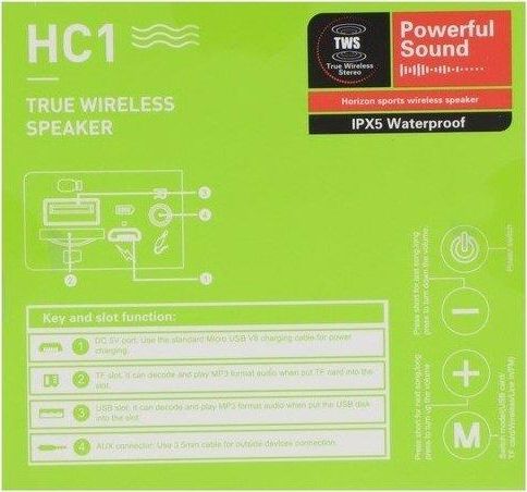 Спикер: 52мм, 5W. Аккумулятор: 1200mAh. Спецификация BT: BT V5.0 JL. Функции: поддержка беспроводного воспроизведения, звонков, FM, TF, USB, AUX, TWS режимов воспроизведения. Зарядное напряжение: DC 5V, время зарядки около 2 часов. В режиме звонков / музыки: около 4 часов. Размеры: 142*85*85 мм. Вес: 380 г.