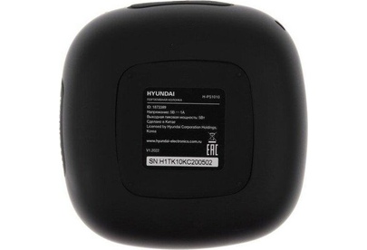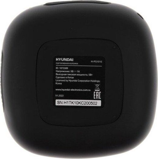 Брэнд: HYUNDAI; Модель (колонки): H-PS1010; Интерфейс подключения: Bluetooth; Радиус действия Bluetooth, до: 10 м; Акустический тип: 1.0; Суммарная звуковая мощность: 5 Вт; Частотный диапазон: 20 Гц - 20000Гц; Отношение сигнал/шум: 90 дБ; Версия Bluetooth: v5.0; Встроенный радиоприемник: есть; Диапазоны радиоприемника: FM; Частоты FM-диапазона: 87.5-108 МГц; Поддержка карт памяти: microSD; Расположение регуляторов: на верхней панели; Тип электропитания: от аккумулятора; Емкость аккумулятора: 1200 mAh; Время работы: до 7 ч; Время зарядки: 3 ч; Материал корпуса: пластик, ткань; Цвет: черный; Размеры (ШхВхГ): 95 x 95 x 48 мм
