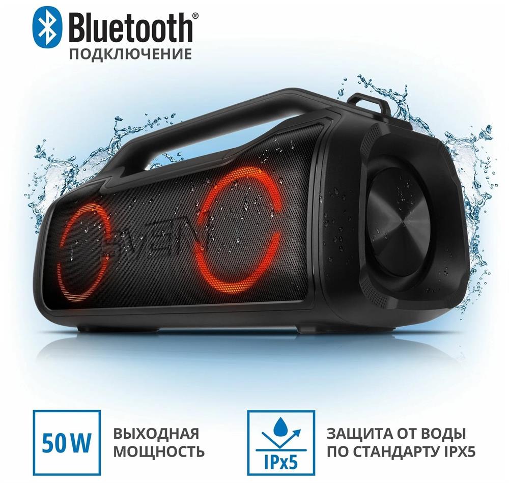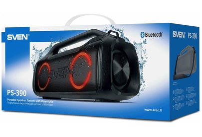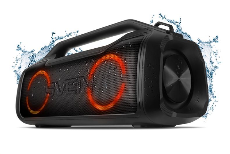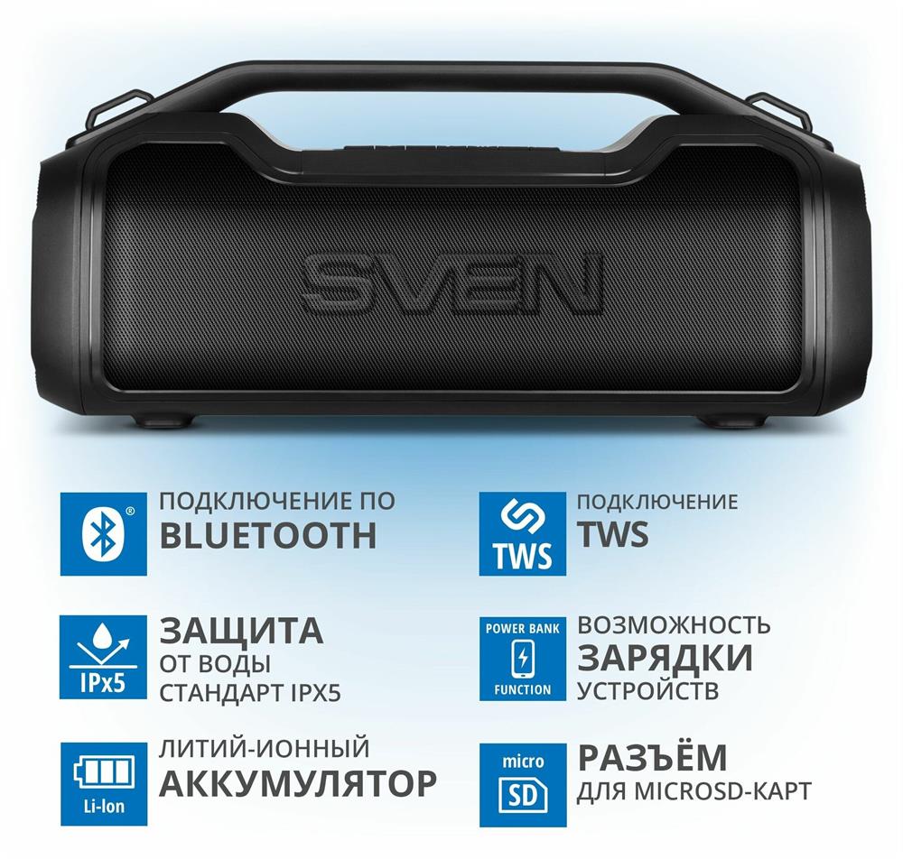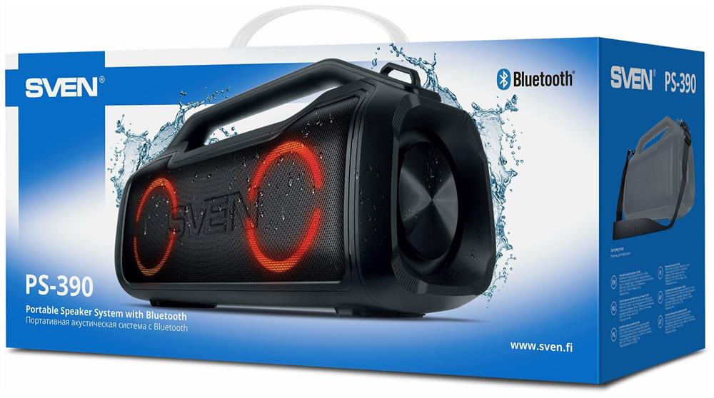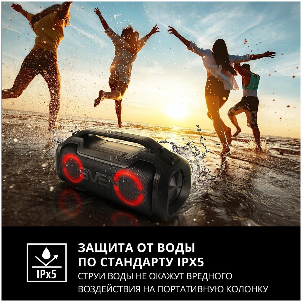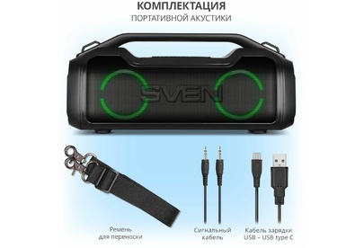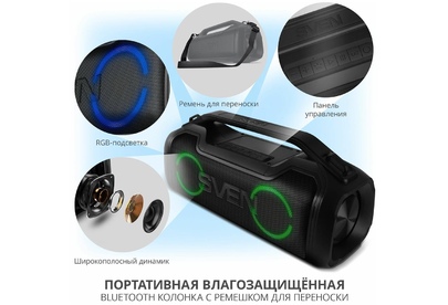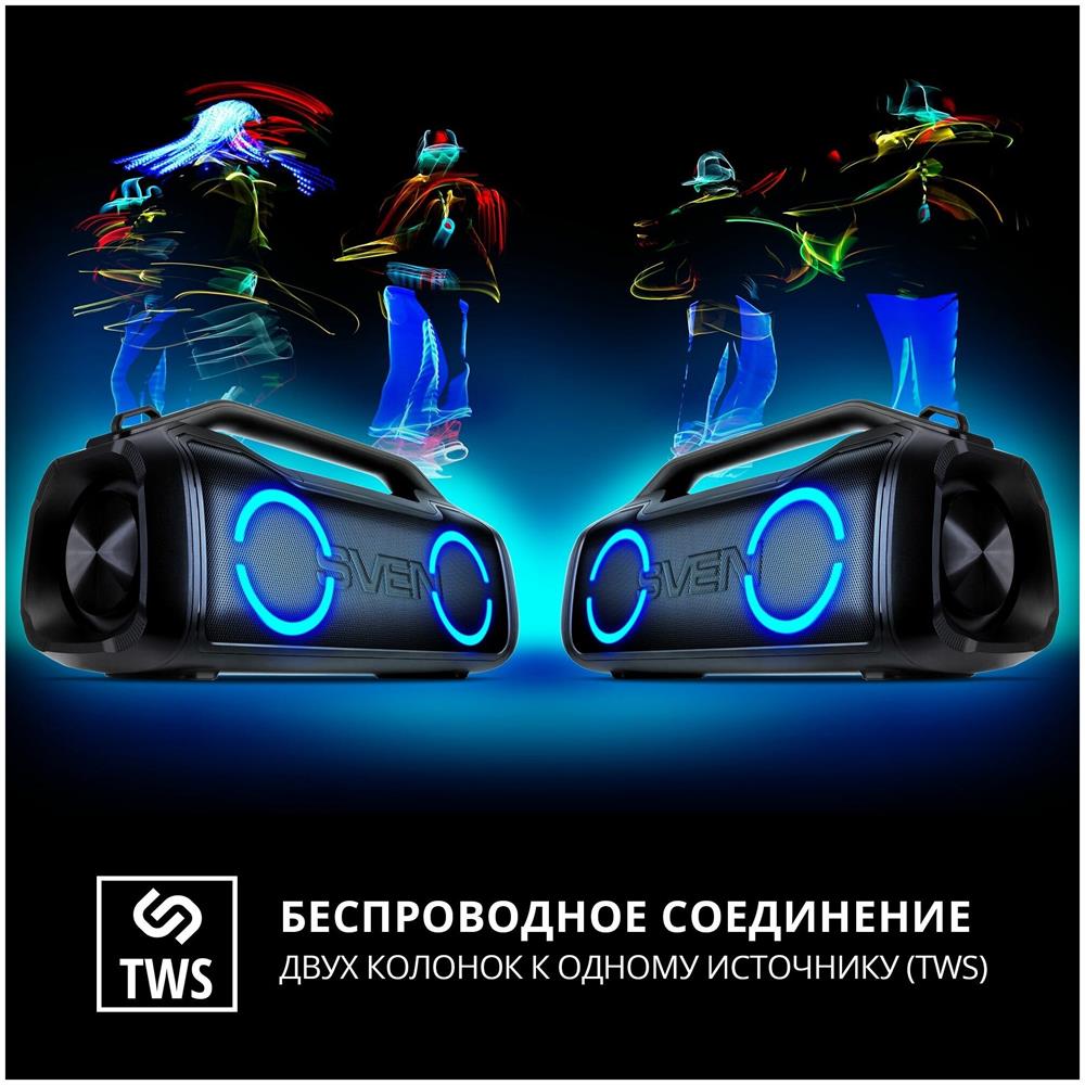 Портативная акустика SVEN PS-390, черный, акустическая система 2.0, мощность 2x25 Вт (RMS), Waterproof (IPx5), TWS, Bluet