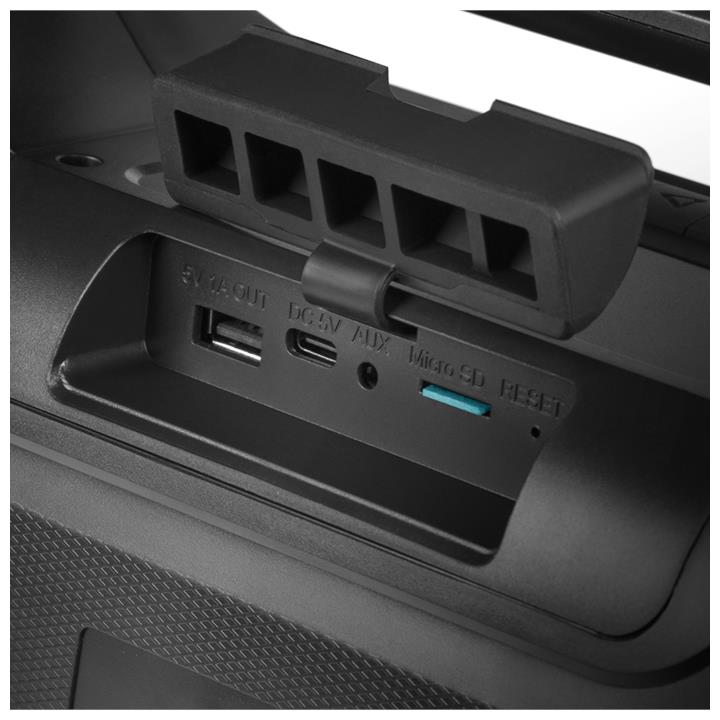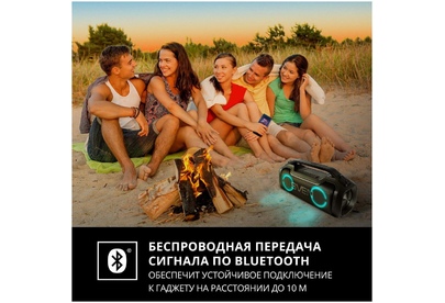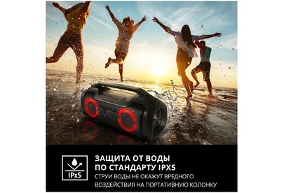 Эффектная разноцветная подсветка Защита от воды (IPx5) Беспроводная передача сигнала по Bluetooth Возможность зарядки мобильных устройств Выходная мощность (RMS), Вт 50 (2 ? 25) Частотный диапазон, Гц 50 – 20 000 Размеры динамиков, мм O 85 Беспроводная передача сигнала по Bluetooth да Воспроизведение музыки с носителей памяти microSD Источник питания литий-ионный aккумулятор: 3600 мA · час (2 шт.) USB: DC 5 V Номинальный ток потребления, А 0,76 Тип соединения Bluetooth, проводной Радиус действия, м до 10