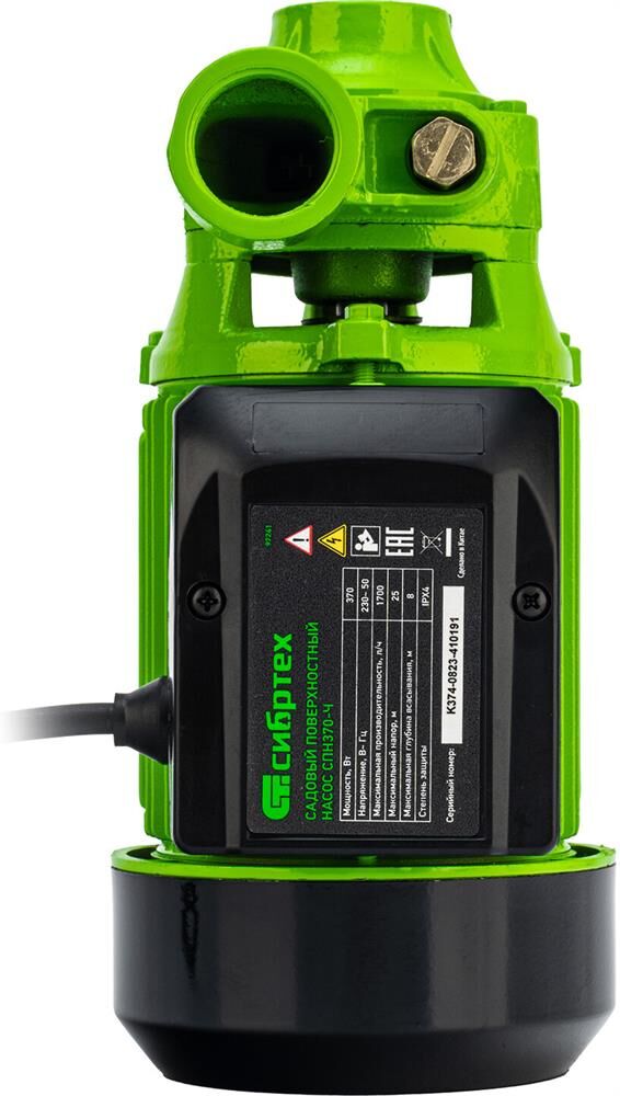 Поверхностный насос СИБРТЕХ Садовый поверхностный насос СПН370-Ч, 370 Вт, напор 25 м, 1700 л/ч, чугун 97241