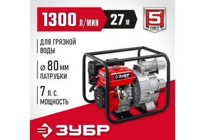 Назначение: для грязной воды. Вид двигателя: 4-х тактный. Высота всасывания: 8. Высота подъема: 27. Диаметр выходного отверстия: 80. Мощность (Вт): 9600. Производительность: 1300. Тип двигателя: бензиновый. Диаметр входного отверстия: 80. Допустимый диаметр твердых частиц: 30. Емкость топливного бака: 6. Объем двигателя: 389. Производитель двигателя: ЗУБР. Стартер: ручной. Вес: 67. Габариты упаковки (ед) ДхШхВ: 0.555x0.445x0.455. Вес упаковки (ед): 39. Переносная: да. Страна производства: Китай. Для полива: да. Класс применения: бытовая. Наличие рамы: да. Гарантия: 12 мес.. Производительность: 1300 л/мин. Допустимый диаметр твердых частиц: 30 мм. Емкость топливного бака: 6 л. Диаметр: входного отверстия 80 мм, выходного отверстия 80 мм. Высота: подъема 27 м, всасывания 8 м. Двигатель: бензиновый, 4-х тактный, 389 см3, 9600 Вт. Стартер: ручной