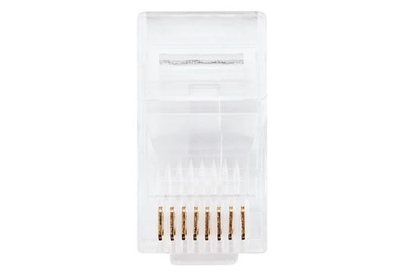 Разъем RJ-45 (8P8C) PROconnect под витую пару предназначен для соединения телекоммуникационного оборудования: компьютеров, офисных АТС, сетевых коммутаторов, концентраторов, коммутационных панелей, маршрутизаторов, патч-панелей, сетевых карт и другого оборудования, имеющего гнездо разъема 8P8C. RJ-45 размещают на конце компьютерных или телефонных кабелей для соединения с розеткой, хабом, свитчем, сервером, модемом, роутером или другим компьютером. Штекер изготовлен из прозрачного пластика, имеет 8 посадочных мест и 8 ножей-контактов. На последние нанесен слой технического золота для создания высокой пропускной способности разъема. Для опрессовки разъема на кабеле необходимо использовать специальный обжимной инструмент. Разъем соответствует международным стандартам IEEE и обеспечивает функцию (PoE). PoE – технология передачи электрической энергии вместе с данными. Характеристики: Тип разъема: RJ-45 (8P8C) Категория: 5e Номинальное напряжение: 48 В Максимальный ток: 600 мА Для круглого кабеля: да Для многопро