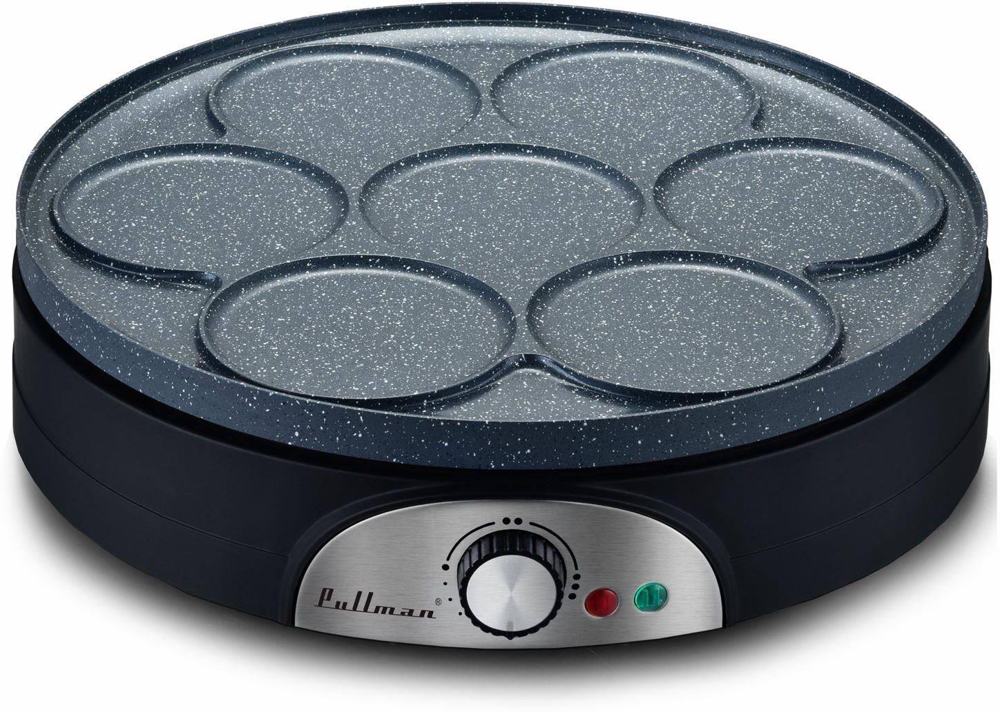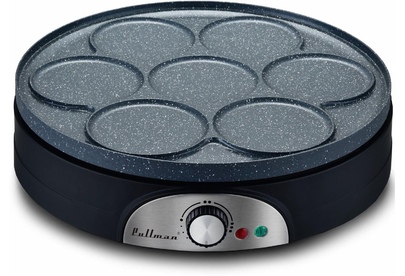 Двухсторонняя панель - 2 прибора в 1: для больших блинов диаметром 37 см или 7 оладий диаметром 11 см. Можно приготовить яичницу на 7 человек одновременно, поджарить бекон, подогреть пиццу, выпекать лепешки, овощные и печеночные оладьи и многое другое Мощность 1500 Вт. Высококачественное керамическое антипригарное покрытие. В комплекте: пластиковые шпатель, лопатка, кисть с силиконовыми ворсинками в подарок Размеры аксессуаров: шпатель для теста 16*13,5 см, лопатка 30*3,5*0,38 см, кисть 21*3,5 см. Индикатор нагрева и сети. Регулировка мощности нагрева. Сменные панели – легко мыть Размер прибора 38,5*40*9,8 см. Внутренний диаметр на большой блин - 37,2 см. Внутренний диаметр на малый блин - 11,1 см. Электропровод 75 см. Вес прибора – 2.6 кг.