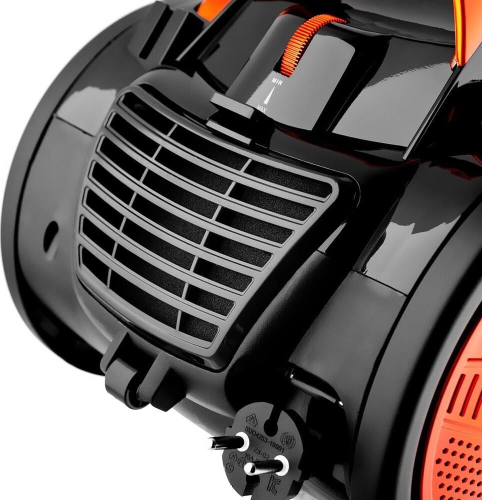 Максимальная мощность 2200 Вт. Multy Cyclone Technology. Мощность всасывания 400 Вт. 5-ступенчатая система фильтрации с HEPA фильтром. Ёмкость контейнера для пыли 3 л. Стальная телескопическая труба. Универсальная щётка с переключателем пол/ковёр. Дополнительные насадки: – щётка для чистки мебели. – щелевая насадка. Длина шнура 5 м. Автоматическая смотка шнура. Ручка горизонтальной переноски. Электропитание 220-240 В, ~50/60 Гц.