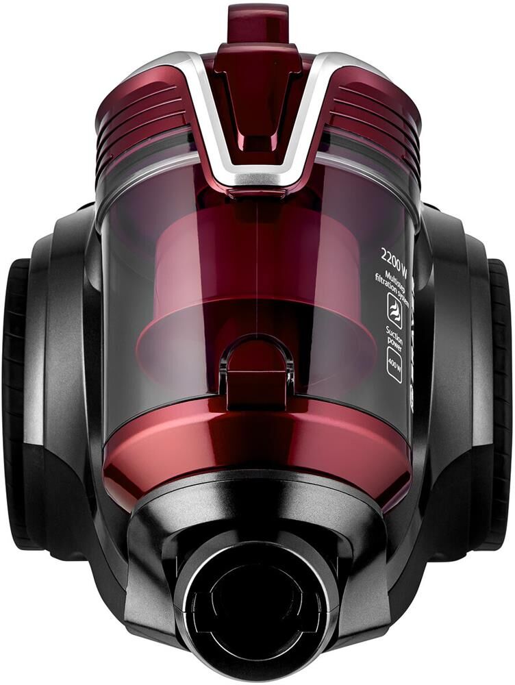 Максимальная мощность 2200 Вт Multi Cyclone Technology Дистанционное управление на ручке Мощность всасывания 400 Вт 5-ступенчатая система фильтрации с HEPA-фильтром Ёмкость контейнера для пыли 3 л Удлинённая стальная телескопическая труба (92 см) Турбощетка Дополнительные насадки - щётка для чистки мебели - щелевая насадка Длина шнура 5 м Автоматическая смотка шнура Ручка горизонтальной переноски Электропитание 220-240 В, ~50/60 Гц