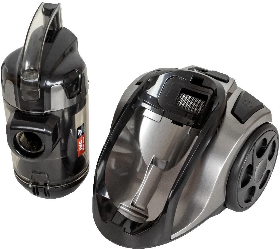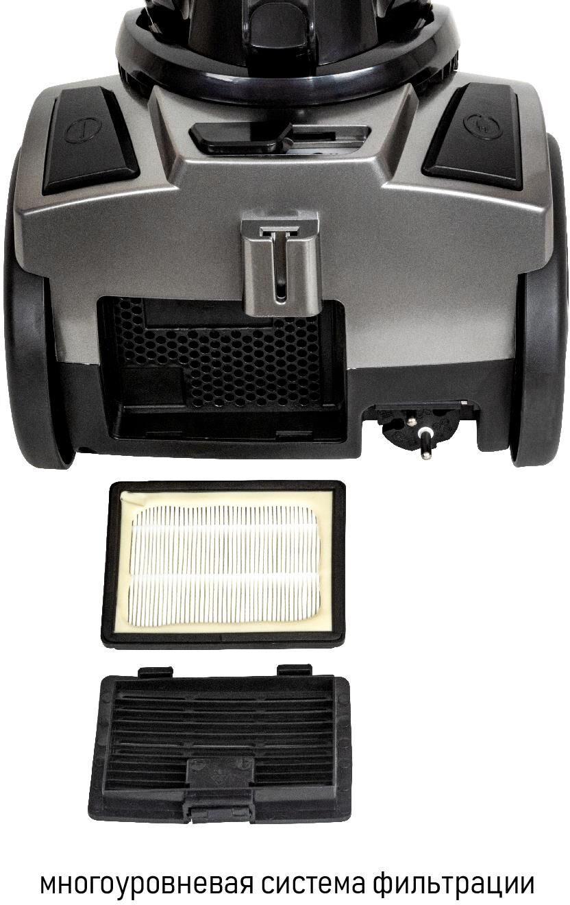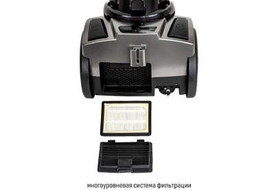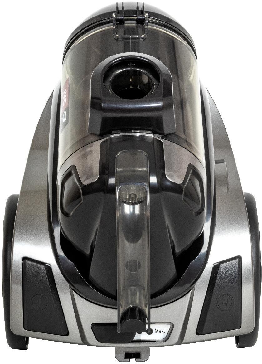 Пылесос циклонного типа, максимальная мощность 1800 ватт, объем контейнера 2 литра, моющийся фильтр HEPA, регурировка уровня мощности, управление воздушным потоком на ручке, уровень шума 79 дБ, металлическая телескопическая трубка, универсальная щетка ковер/пол, щелевая насадка 2 в 1, насадка для мягкой мебели, держатель для аксессуаров, автоматическая смотка шнура, длина кабеля 5 метров