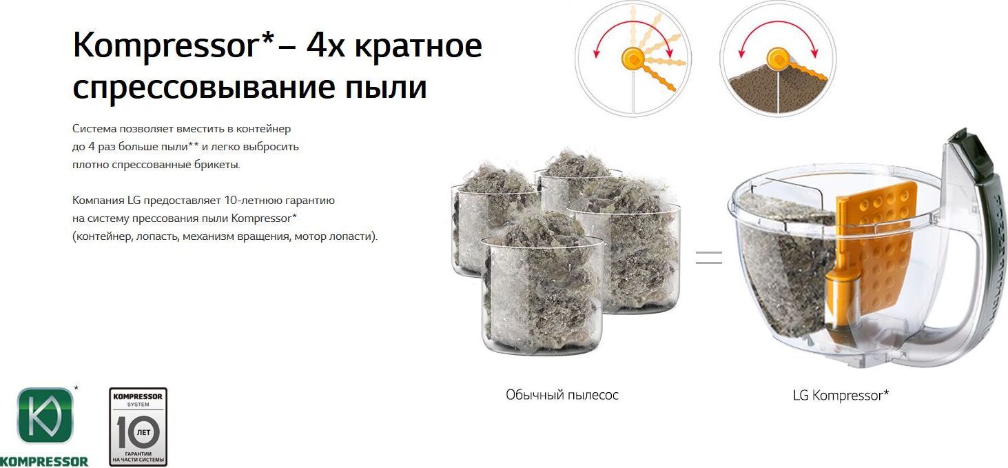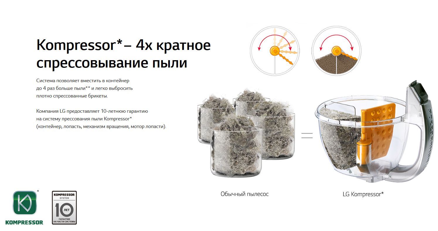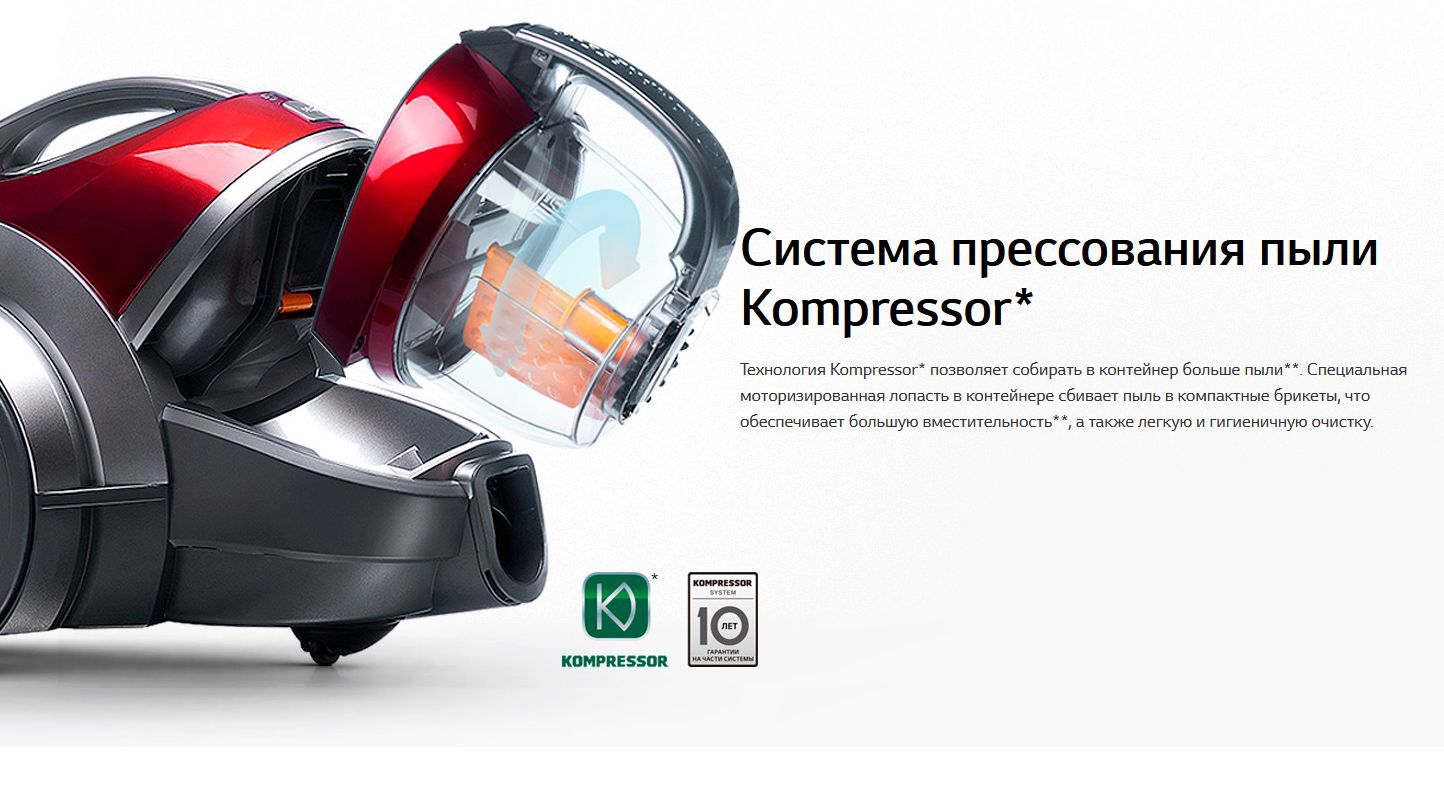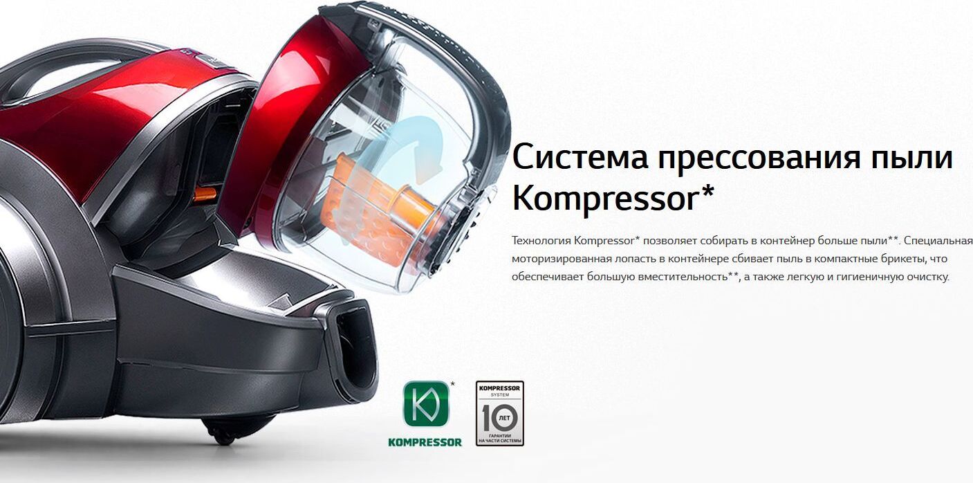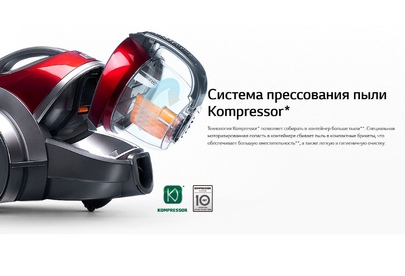 LG VK89689HU Пылесос с автоматической системой прессования пыли Kompressor Технология прессования пыли Kompressor Высокая мощность всасывания Система фильтрации пыли “Турбоциклон” Легкое и гигиеничное очищение Тип бытовой пылесос Тип уборки сухая Мощность всасывания, Вт 1800 Тип пылесборника контейнер Фильтр тонкой очистки есть Потребляемая мощность, Вт 380 Регулятор мощности на рукоятке Уровень шума, дБ 77 Цвет красный Насадки в комплекте Комбинированная насадка пол/ковер, щелевая насадка, турбо-щетка, щетка 2-в-1 (для пыли/мягкой мебели) Дополнительная информация Пылесос с автоматической системой прессования пыли Kompressor: позволяет собирать в контейнер больше пыли. Специальная моторизированная лопасть в контейнере сбивает пыль в компактные брикеты, что обеспечивает большую вместительность, а также легкую и гигиеничную очистку. Вес, кг 6.1 Размеры (ШxГxВ) 285x305x445мм