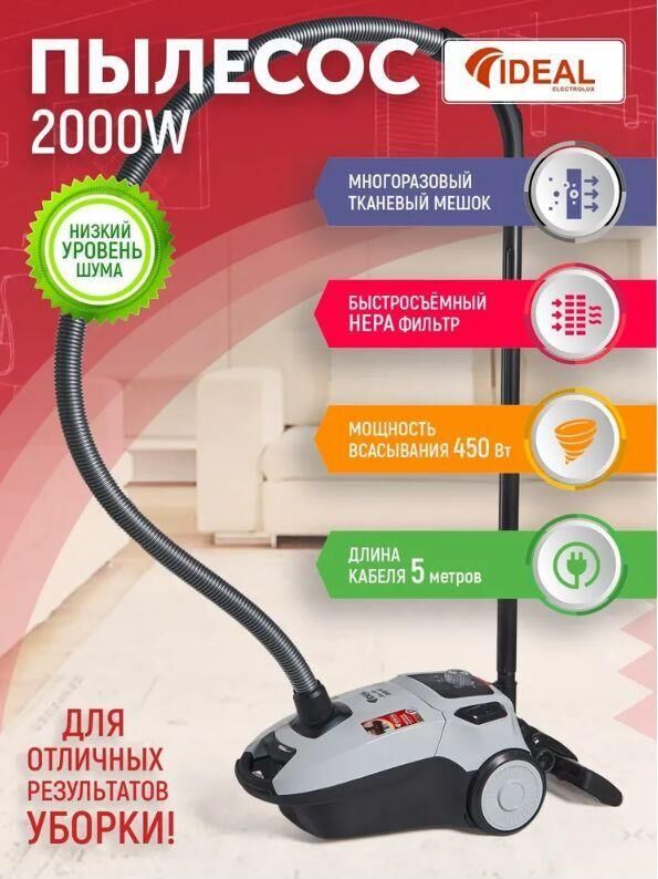 Класс энергопотребления А. Тип пылесоса с мешком. Тип уборки Сухая. Мощность всасывания 450 Вт. Потребляемая мощность 2000 Вт. Объем пылесборника 2,3 л. Регулировка мощности на корпусе. Тип фильтра микрофильтр. Насадки для ламината/ паркета, пол-ковер,щелевая. Дополнительные насадки Щетка для пыли. Фильтрация НЕРА. Длинна шнура 5 метров. Автосматывание шнура есть. Парковка универсальная. Расход воздуха 41л/с. Разрежение 33 кпд. Уровень шума 82дБ. Плавный запуск двигателя SOFТSTART.
